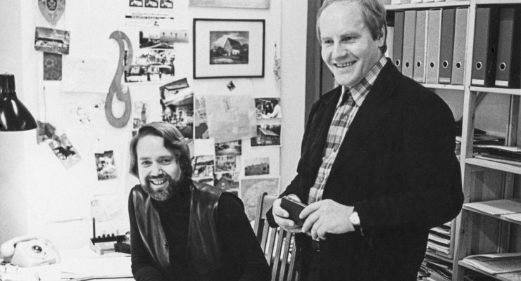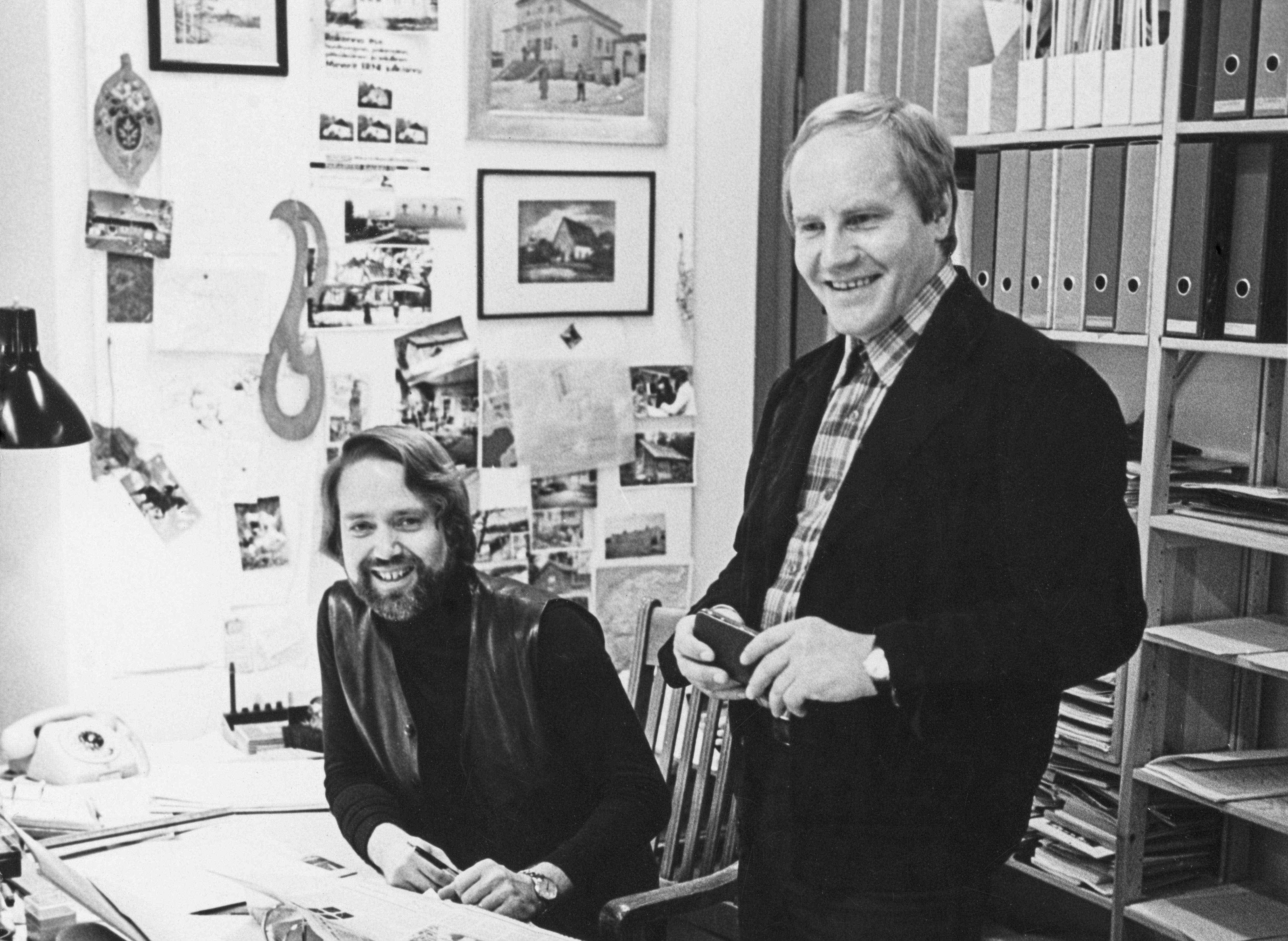 Panu Kaila ja Elias Härö toimistolla 1960–1970-lukujen vaihteessa. Parivaljakon Pohjalainen talo: Rakentajan opas sai tiedonjulkistamisen valtionpalkinnon vuonna 1977. Kuva: Museovirasto (RHO469650).