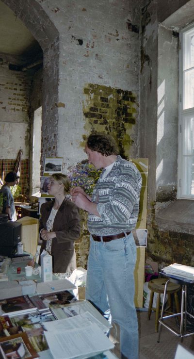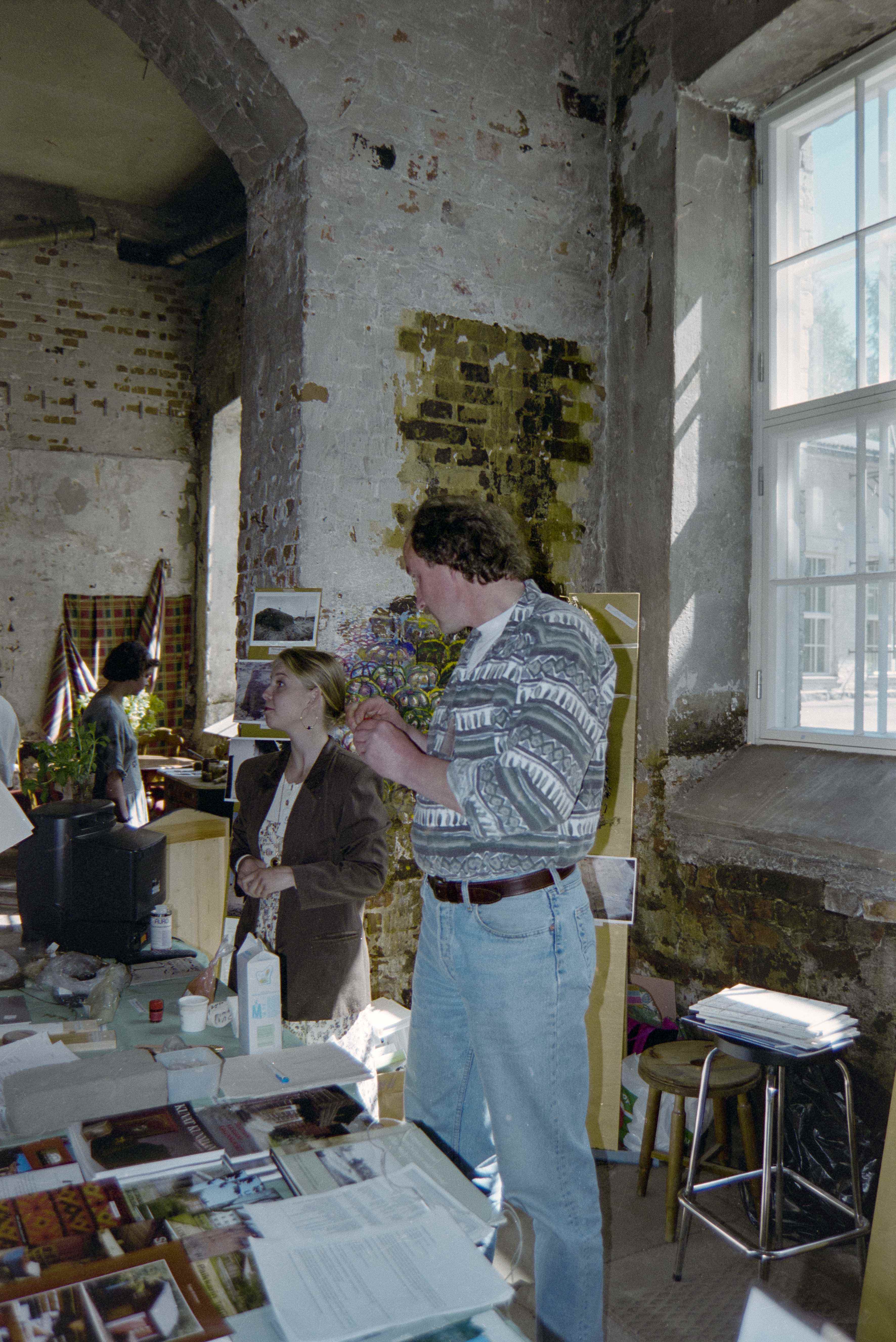 Päivi Eronen ja Olli Cavén Museoviraston osastolla Billnäsin korjausrakennusmessuilla 1996. Kuva: Museovirasto (RHO469678).