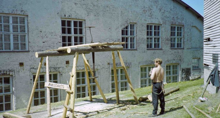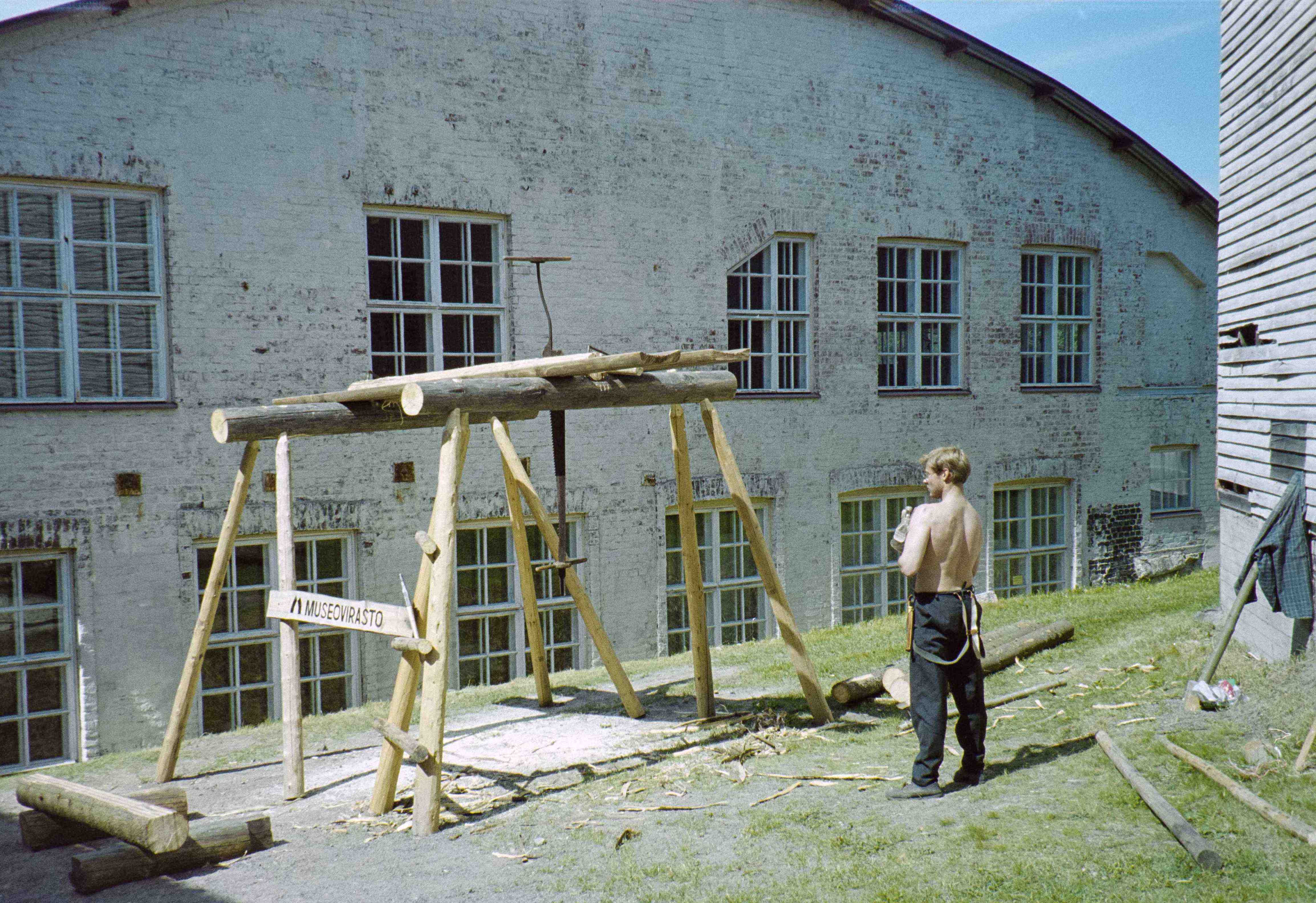 Työnäytteet olivat osa messuesiintymisiä. Niissä esiteltiin perinnerakentamisen tapoja ja välineitä. Risto Holopainen lankkusahan ääressä. Kuva: Museovirasto (RHO469681).