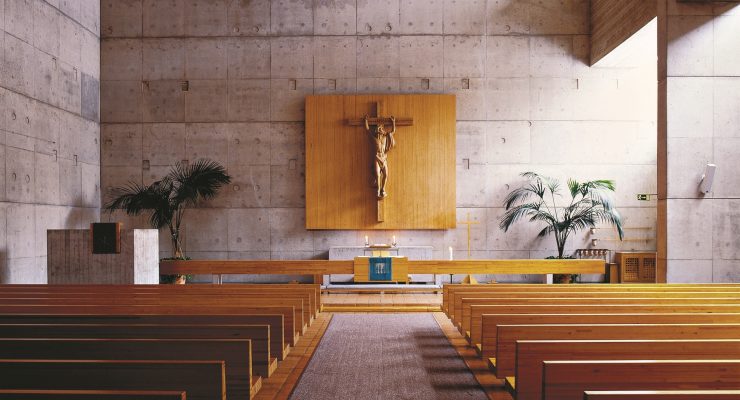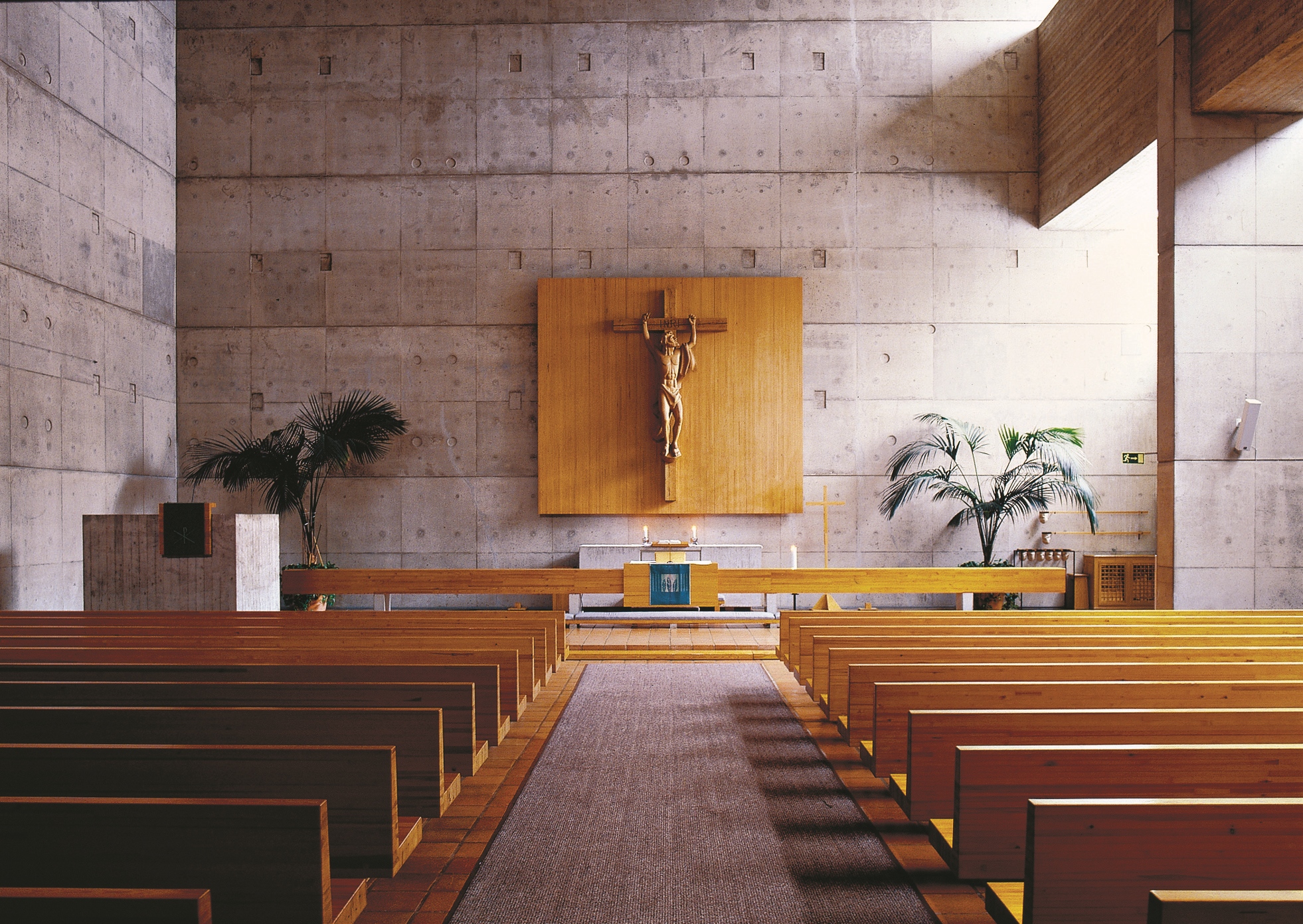 Järvenpään kirkon seinät ovat hierrettyä betonia. Arkkitehti Erkki Elomaan suunnittelema kirkko vihittiin käyttöön vuonna 1968. Kuva: Soile Tirilä, Museovirasto.