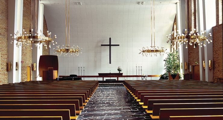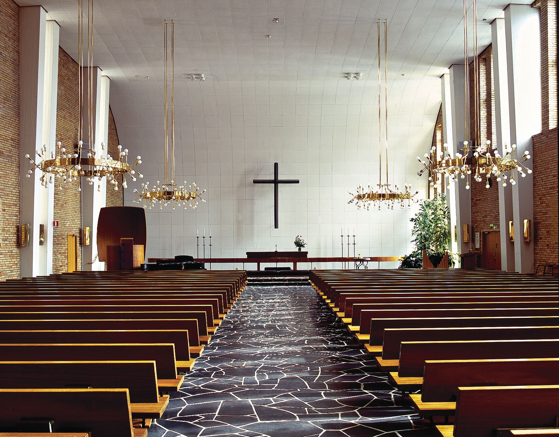 Meilahden kirkko Helsingissä edustaa näyttävästi jälleenrakennuskauden materiaalivalikoimaa ja sen vaikutusta tilan tunnelmaan. Arkkitehti Markus Tavion piirtämä kirkko on vuodelta 1954. Kuva: Soile Tirilä, Museovirasto.