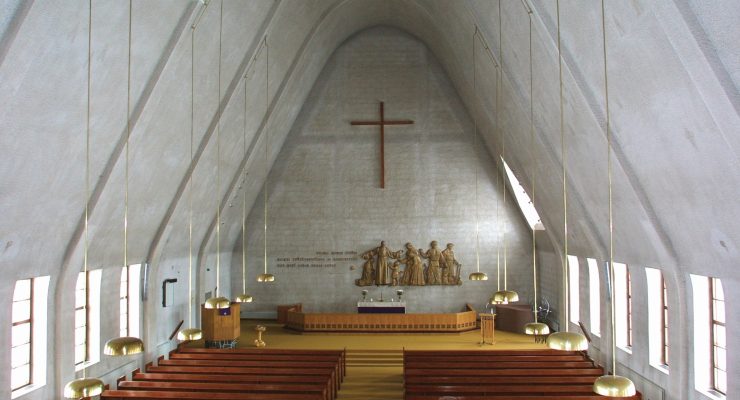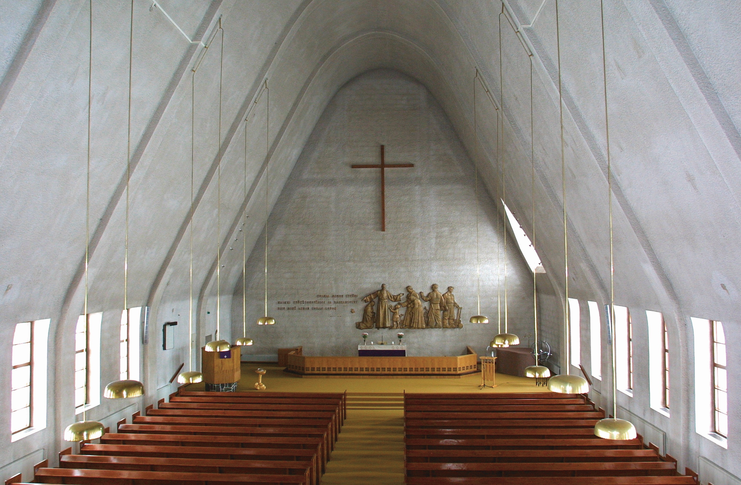 Sallan kirkkokilpailun 1947 voittaneet arkkitehtiylioppilaat Eero Eerikäinen ja Osmo Sipari tulkitsivat keskiaikaisten kivikirkkojen perinnettä modernin rakentamisen keinoin. Alttariseinällä Aimo Tukiaisen reliefi. Kuva: Soile Tirilä, Museovirasto.