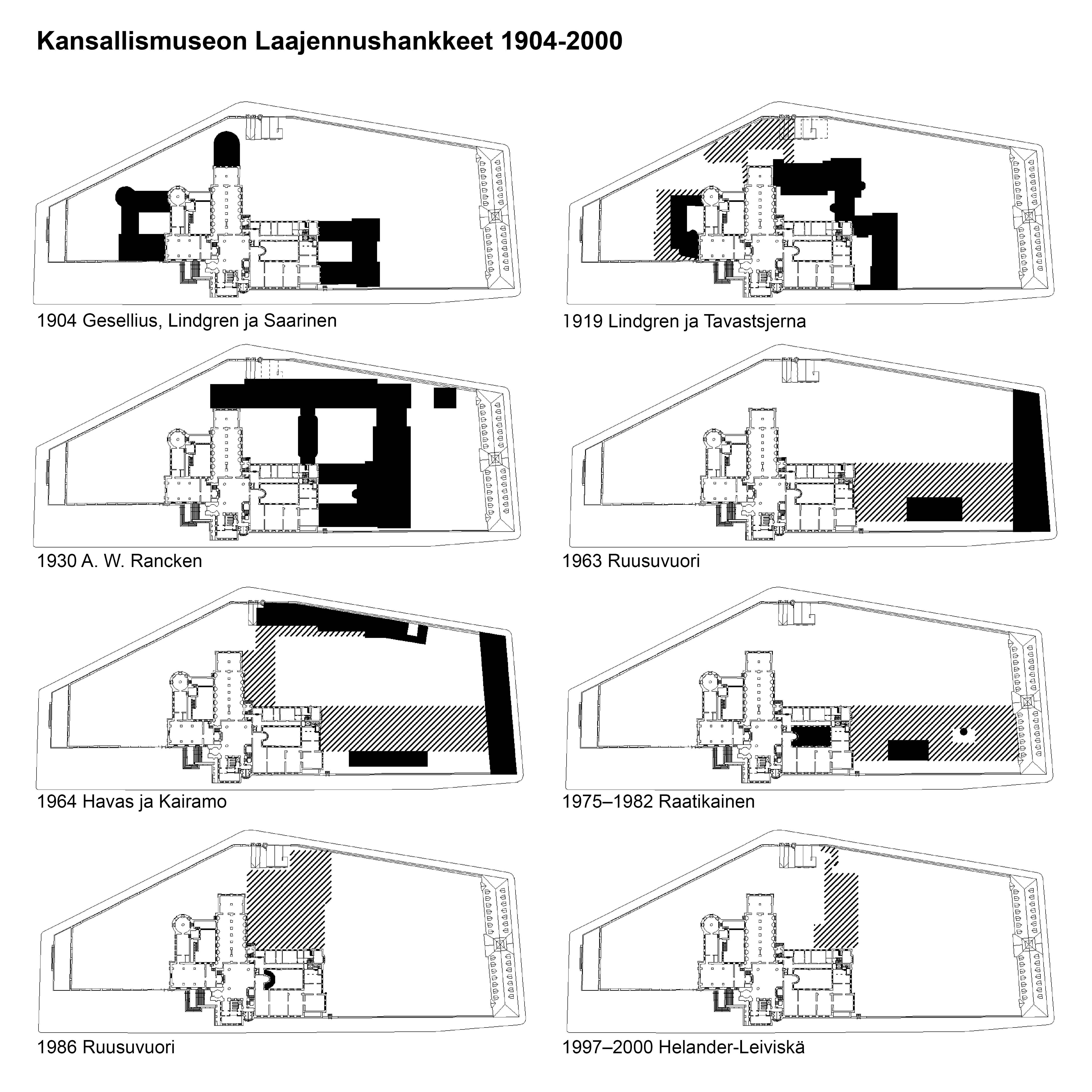 Kansallismuseolle eri aikoina tehdyt laajennussuunnitelmat