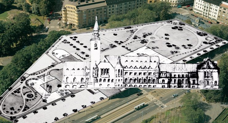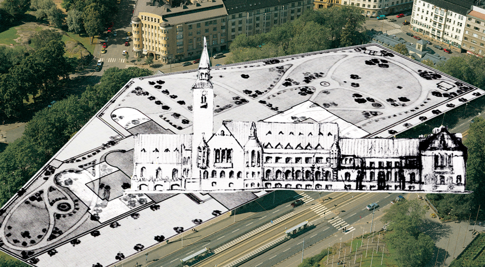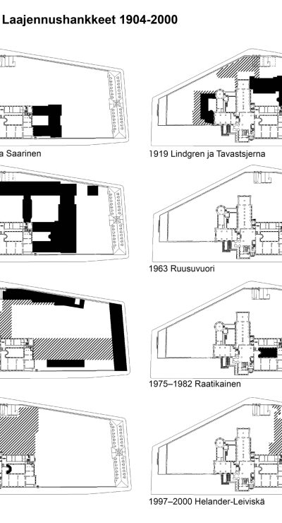1904 Arkkitehdit Gesellius, Lindgren ja Saarinen: pääsiipien laajennuksille varaukset asemapiirrokseen.