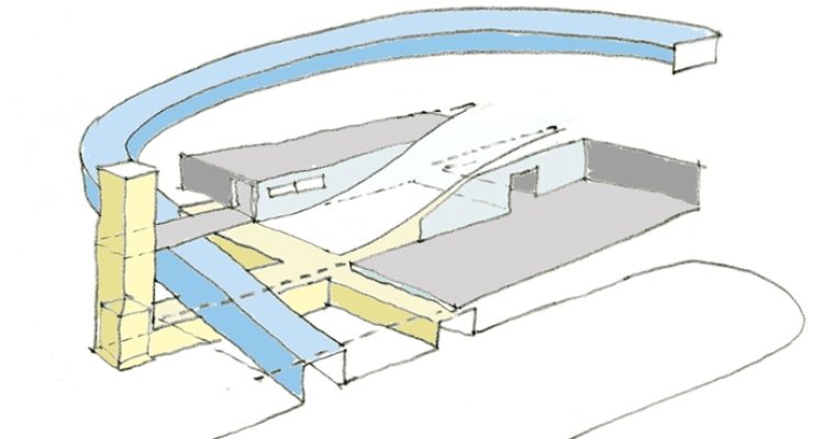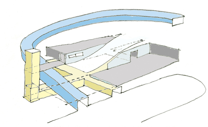 Museon maan alaisten tilojen eri kerrostasojen suunnittelua havainnollistava kuva. Kuva: Tomi Nikander.