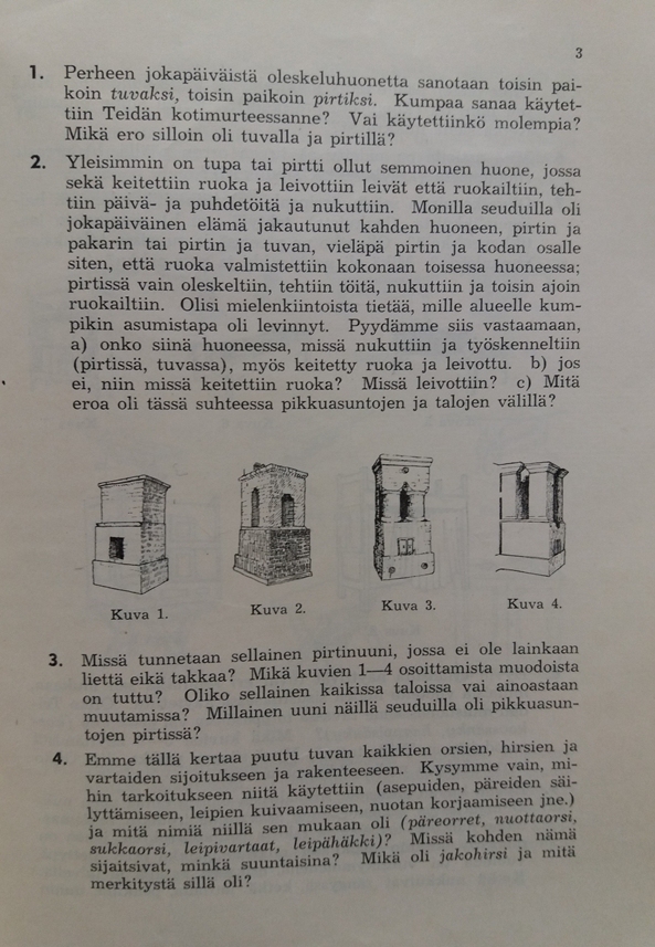 Kyselytoiminta alkoi samana vuonna kun tuli kuluneeksi viisikymmentä vuotta Kansallismuseon perustamisesta. Kansatieteellinen osasto juhlisti merkkivuotta kyselyn laatimisella. Kansallismuseon kansatieteellisen osaston kyselyssä lukijoilta kysyttiin: ”Muistatteko vanhan tuvan ja pirtin?” Myöhempinä vuosina kyselyt koskivat erilaisia esineryhmiä, ruokatyyppejä, valmistustekniikoita, rakennuksia ja huonetiloja. Vuonna 1957 kysyttiin millaisina siirtoväki ja paikallisväestö näkivät toisensa, mikä kuulostaa jälleen ajankohtaiselta. Seuraavana vuonna kyselyllä kartoitettiin kestikievareita samoin kuin hevosia ja valjaita.