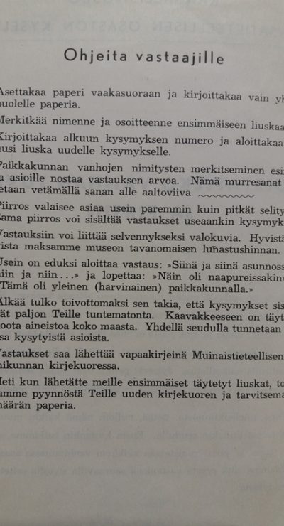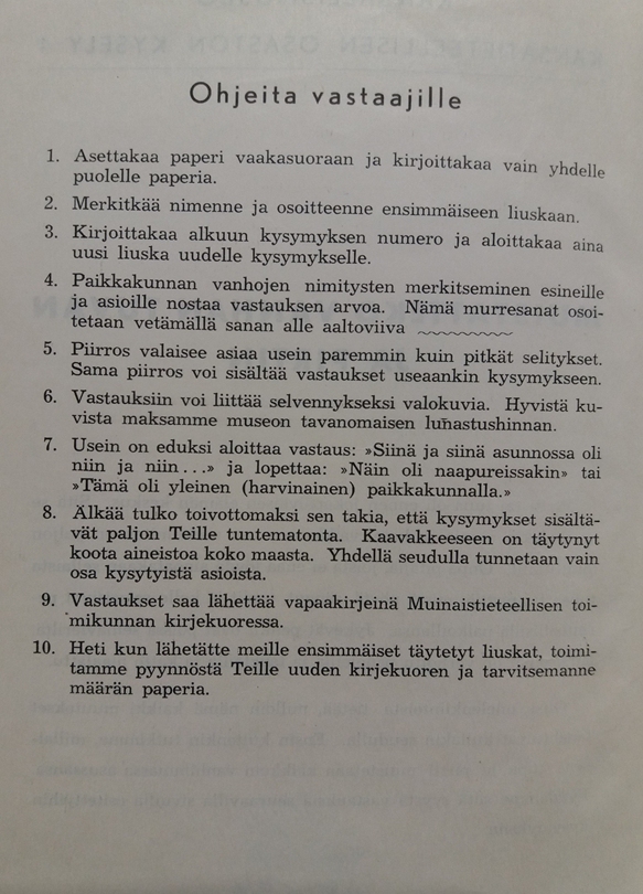 Kansallismuseo. Kansatieteellisen osaston kysely 1. 1956. Muinaistieteellinen toimikunta.