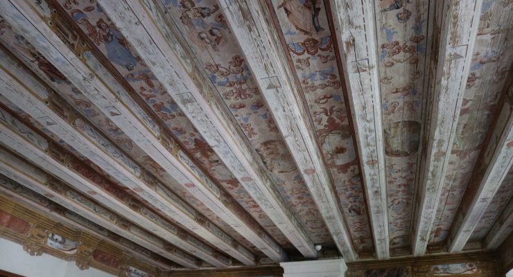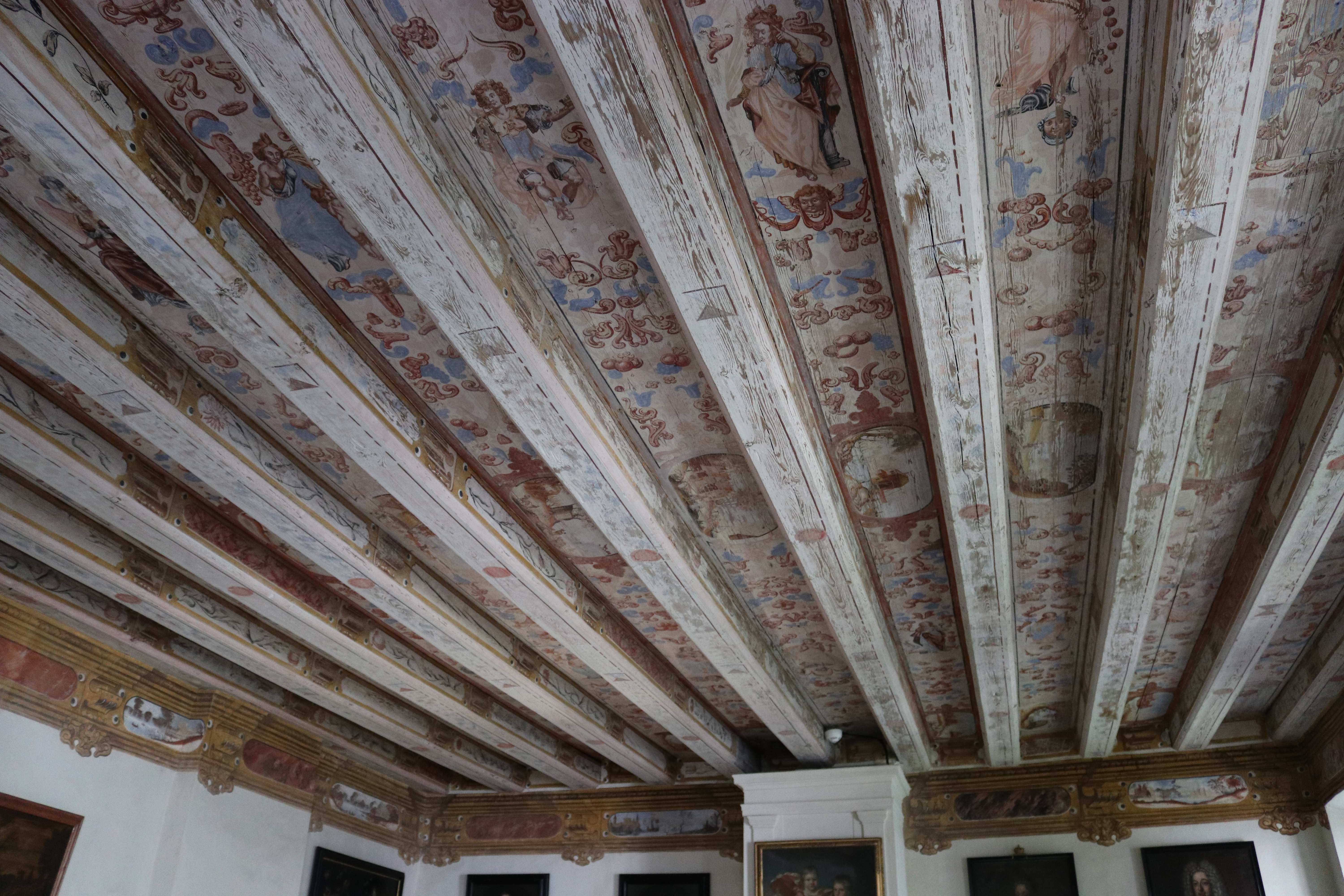 Louhisaaren juhlasalin kattomaalauksien aiheena ovat 1600-luvun maisemat ja sotatapahtumat. Kuva Jouni Marjamäki.