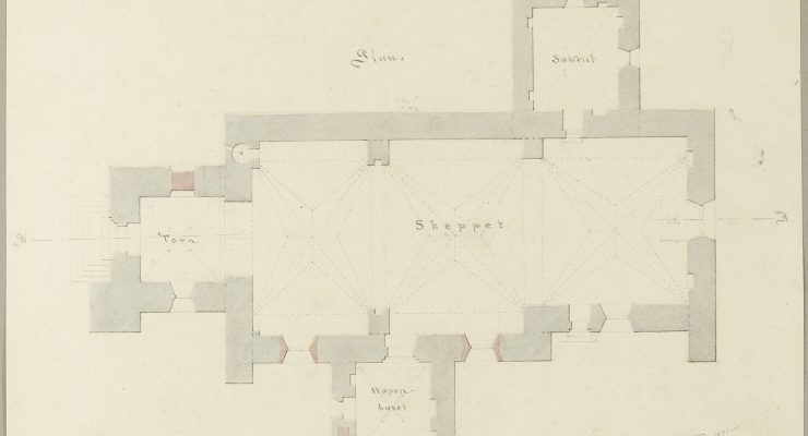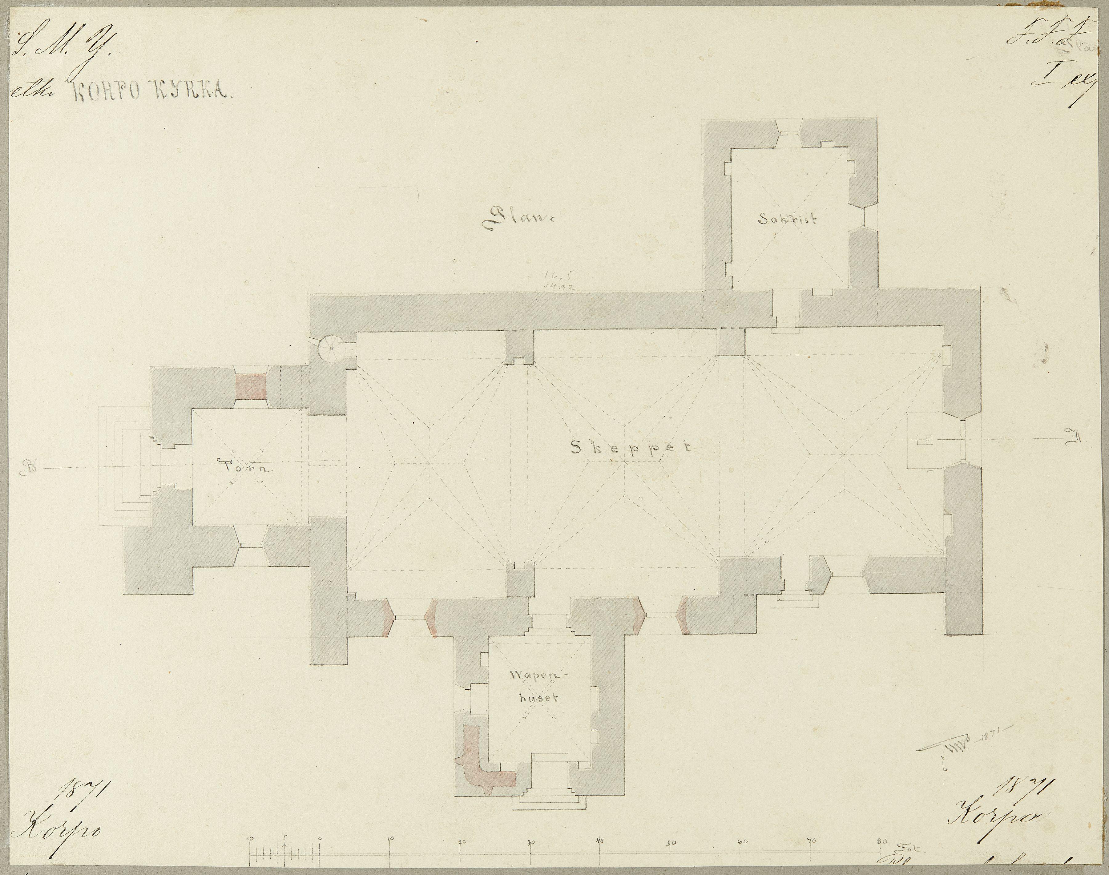 Korppoon kirkon pohjakaavapiirros vuodelta 1871. Kuvalähde: Wolmar Westling, Museovirasto (HK18711016:62).