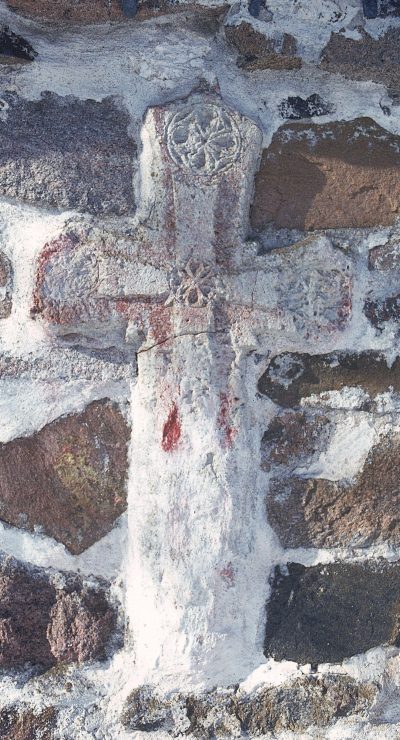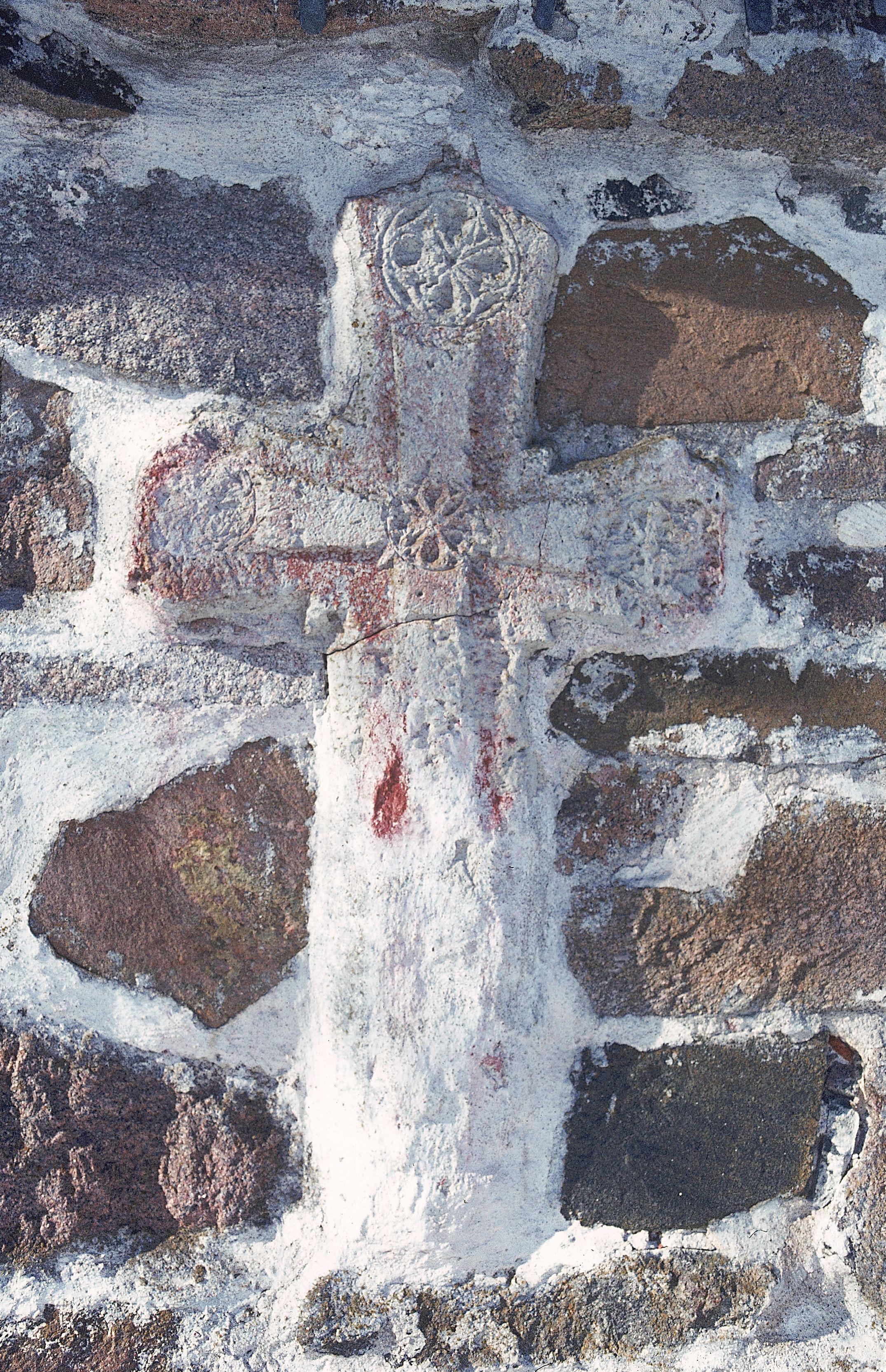Risti Korppoon kirkon kuorinpuoleisessa ulkoseinässä. Kuva: A. Laine 1973. Museovirasto (RHO9184:35).