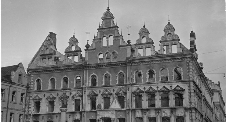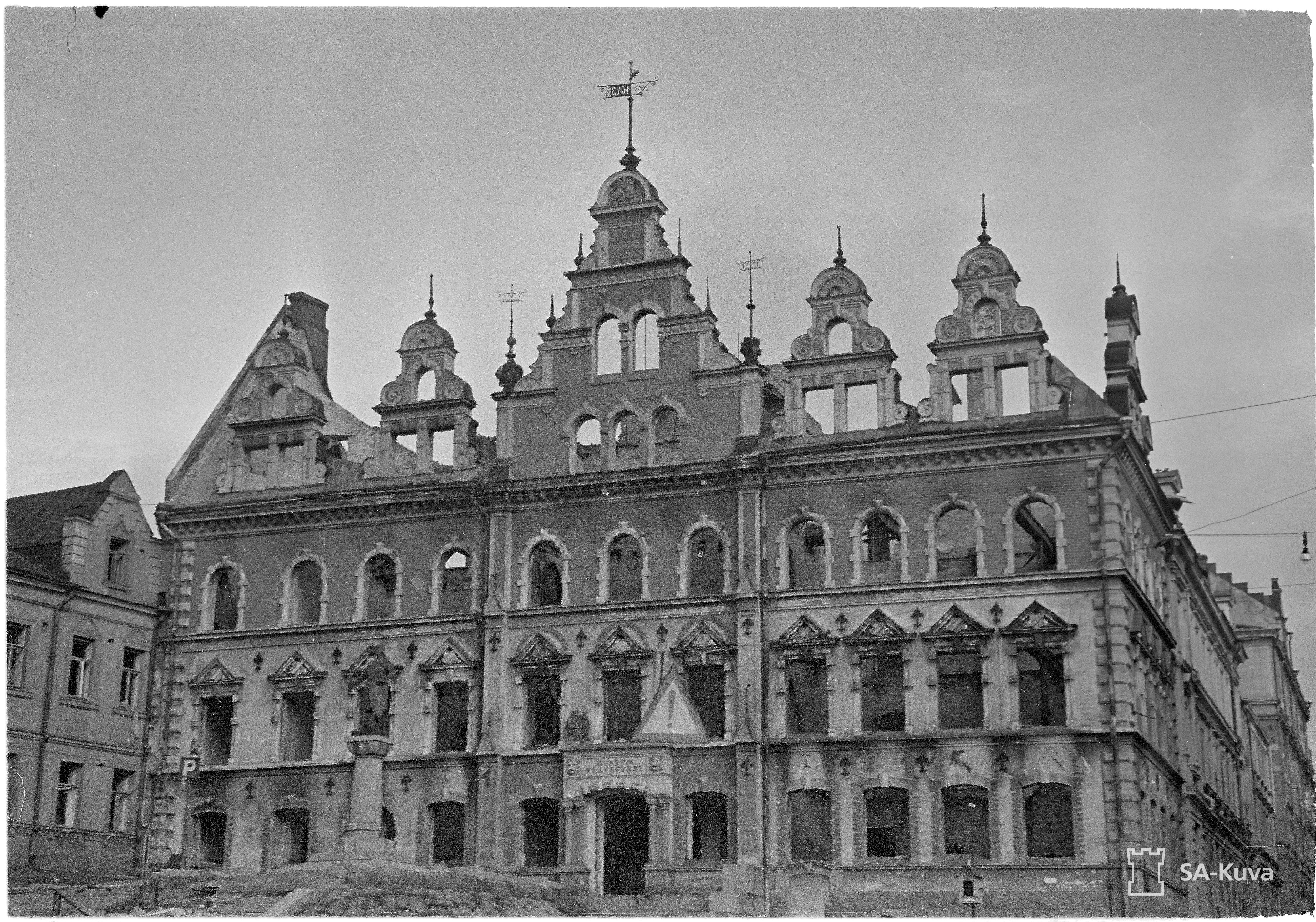 Viipurin historiallinen museo tuhoutui pommista talvisodan viimeisenä päivänä. Ville Vallgrenin Torkkeli Knuutinpojan patsas säilyi kuin ihmeen kaupalla. SA-kuva.