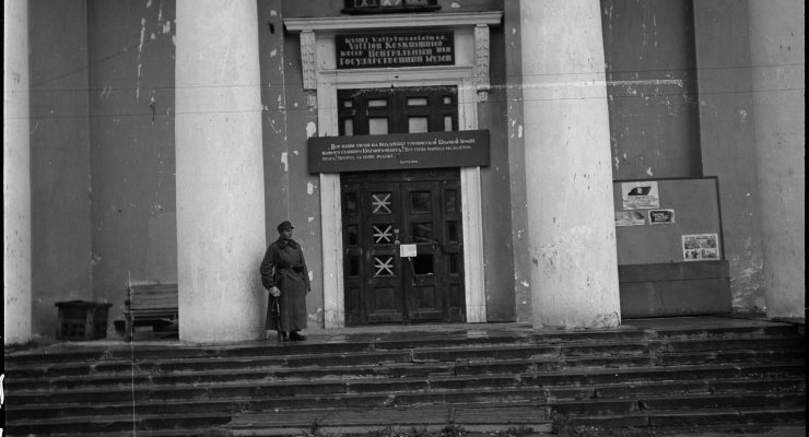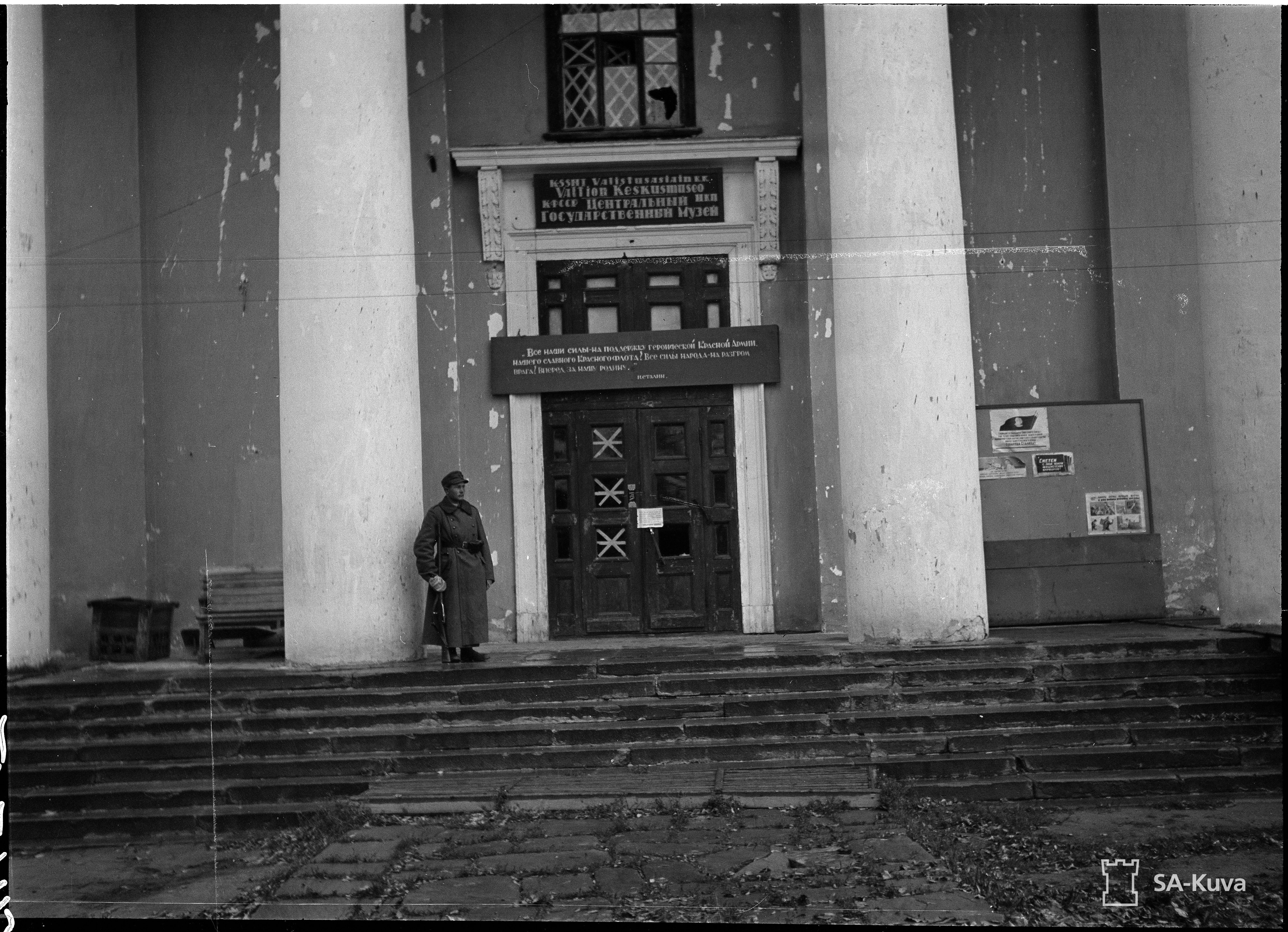 Suomalainen sotilas vartioi Valtion Keskusmuseota pääoven edustalla pian Petroskoin valtauksen jälkeen. Museoon järjestettiin vartiointi, mutta varojen puutteessa se oli epäsäännöllistä, ja museossa kävi jatkuvasti varkaita. Kuva: SA-kuva, 3.10.1941.