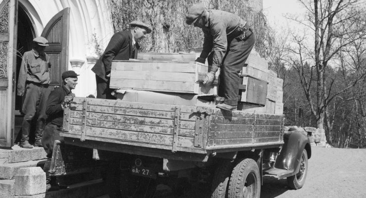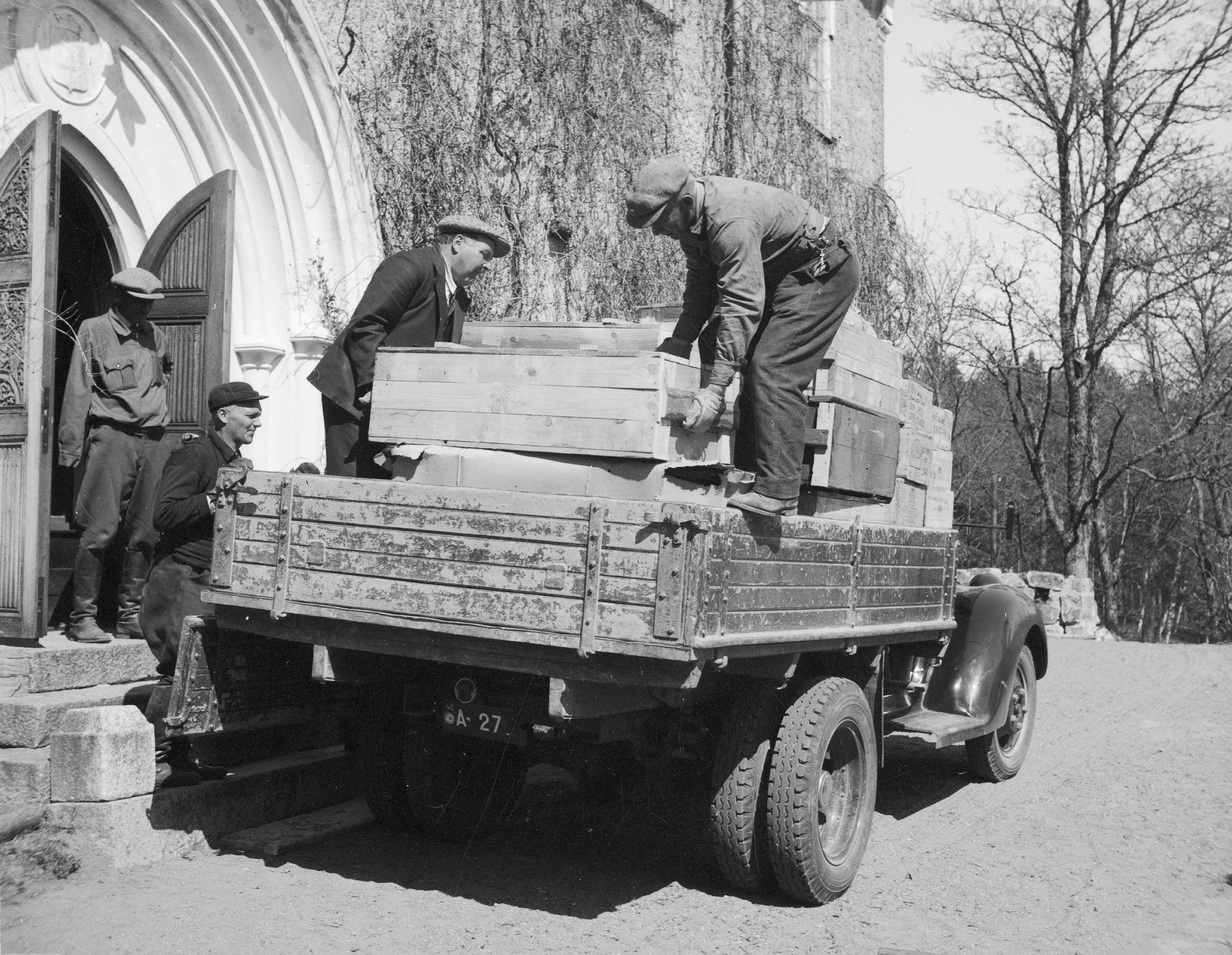 Suomen kansallismuseon esinekokoelmia evakuoitiin syksyllä 1939 Siuntiossa sijaitsevaan Suitian kartanoon. Kuva Auvo Hirsjärvi, Museovirasto.