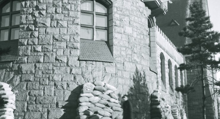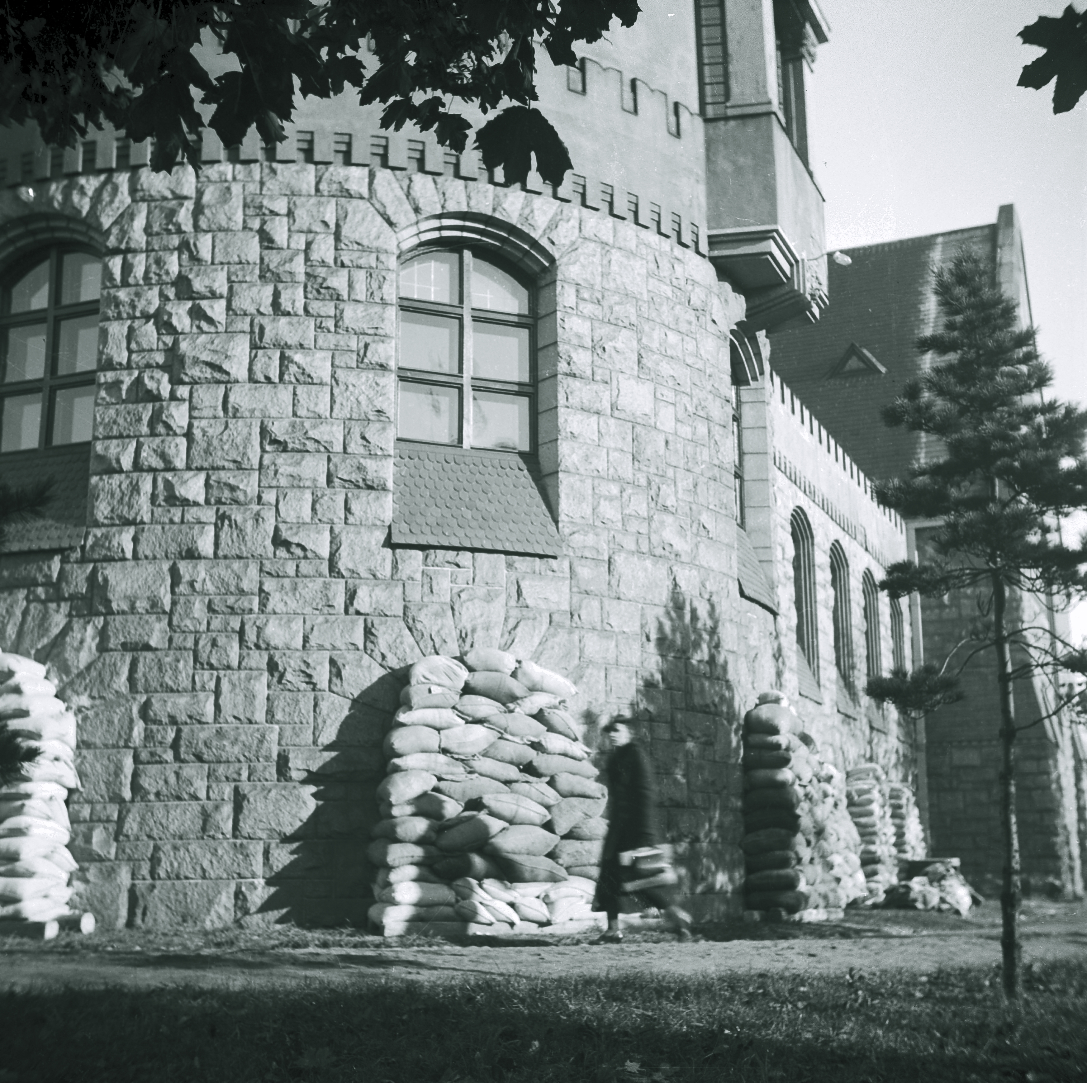 Suomen kansallismuseon ikkuna-aukkojen eteen koottiin talvisodan aikana hiekkasäkkejä. Kuva: Museovirasto.