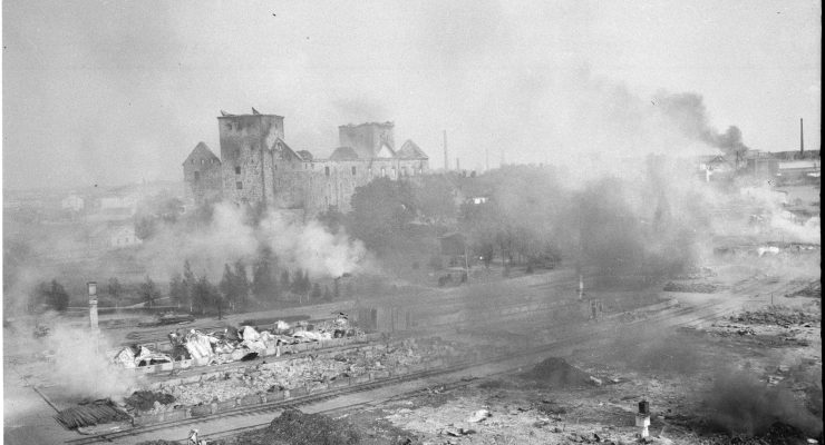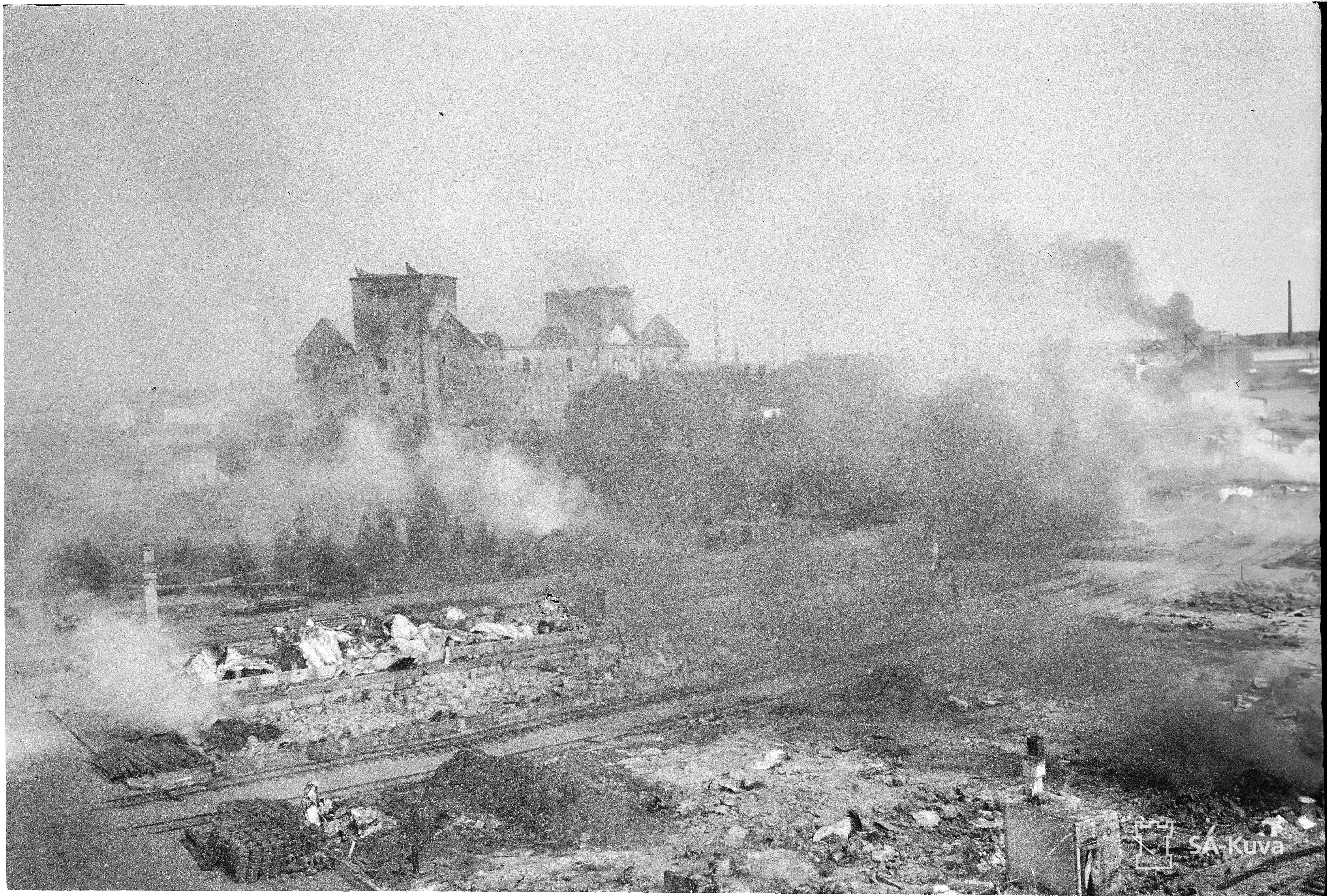 Turun linnan päälinna ja ratapiha-alue olivat neuvostoilmavoimien kiivaan pommituksen kohteena 26. kesäkuuta 1941. Päälinna paloi pahoin. Kuva: E. Suomela, SA-kuva.