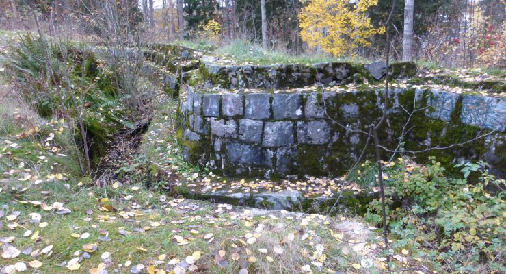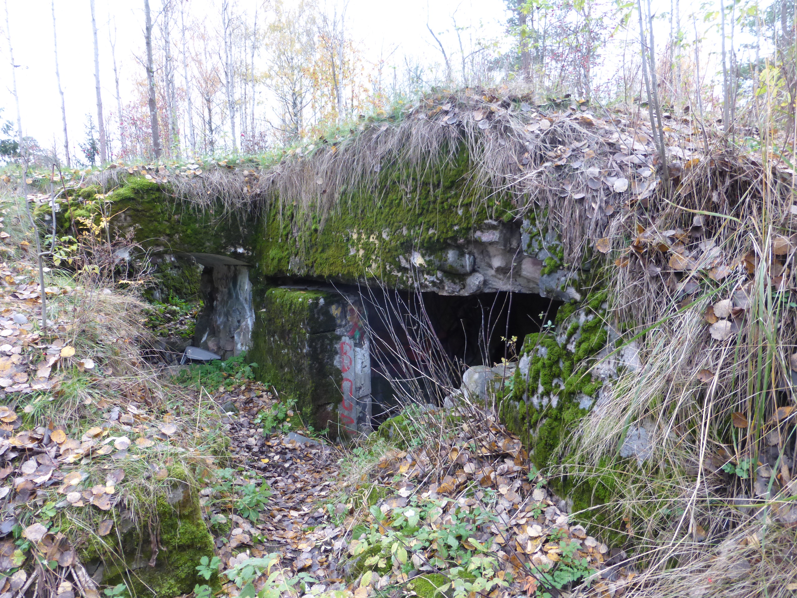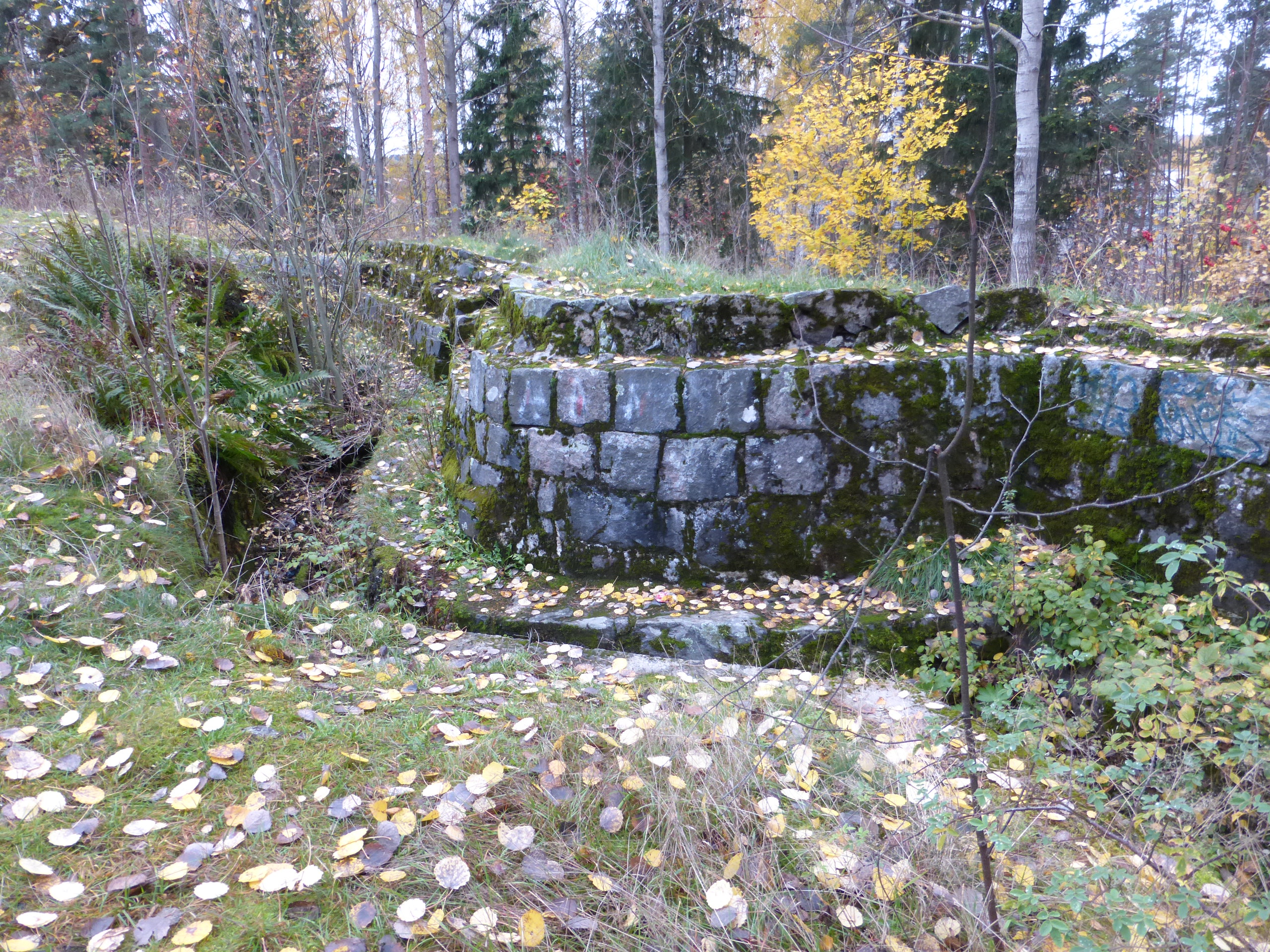 Kallioon louhittuja ja muuratuilla kivillä tuettua taisteluhautaa Kannelmäen Tukikohta XX:4:ssä. Kuva: Ulla Salmela.