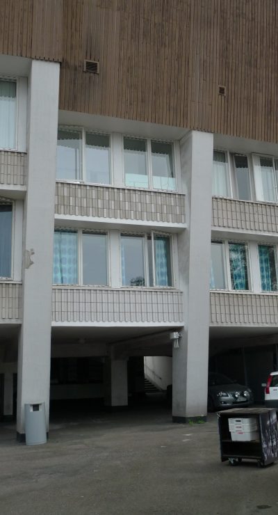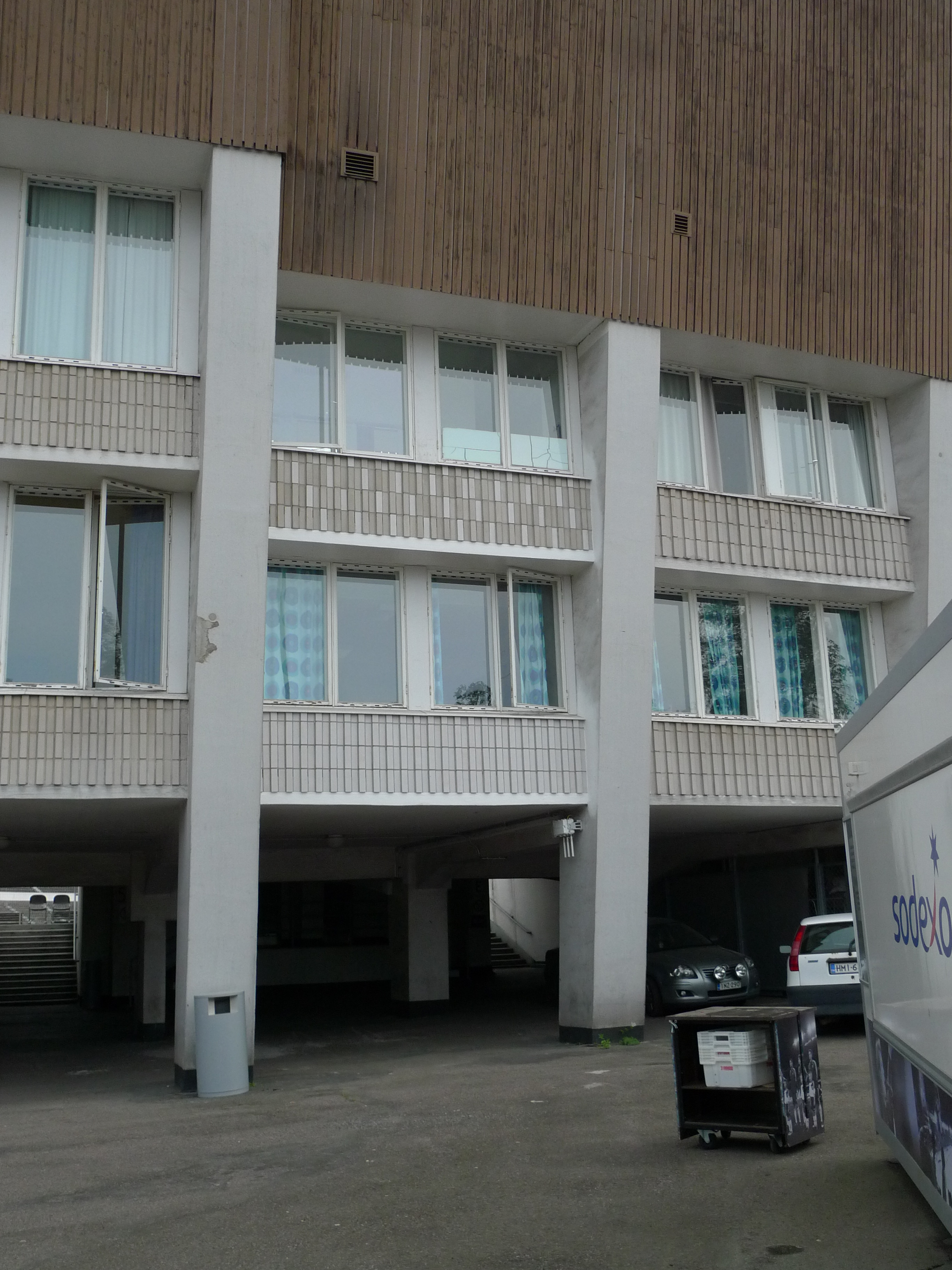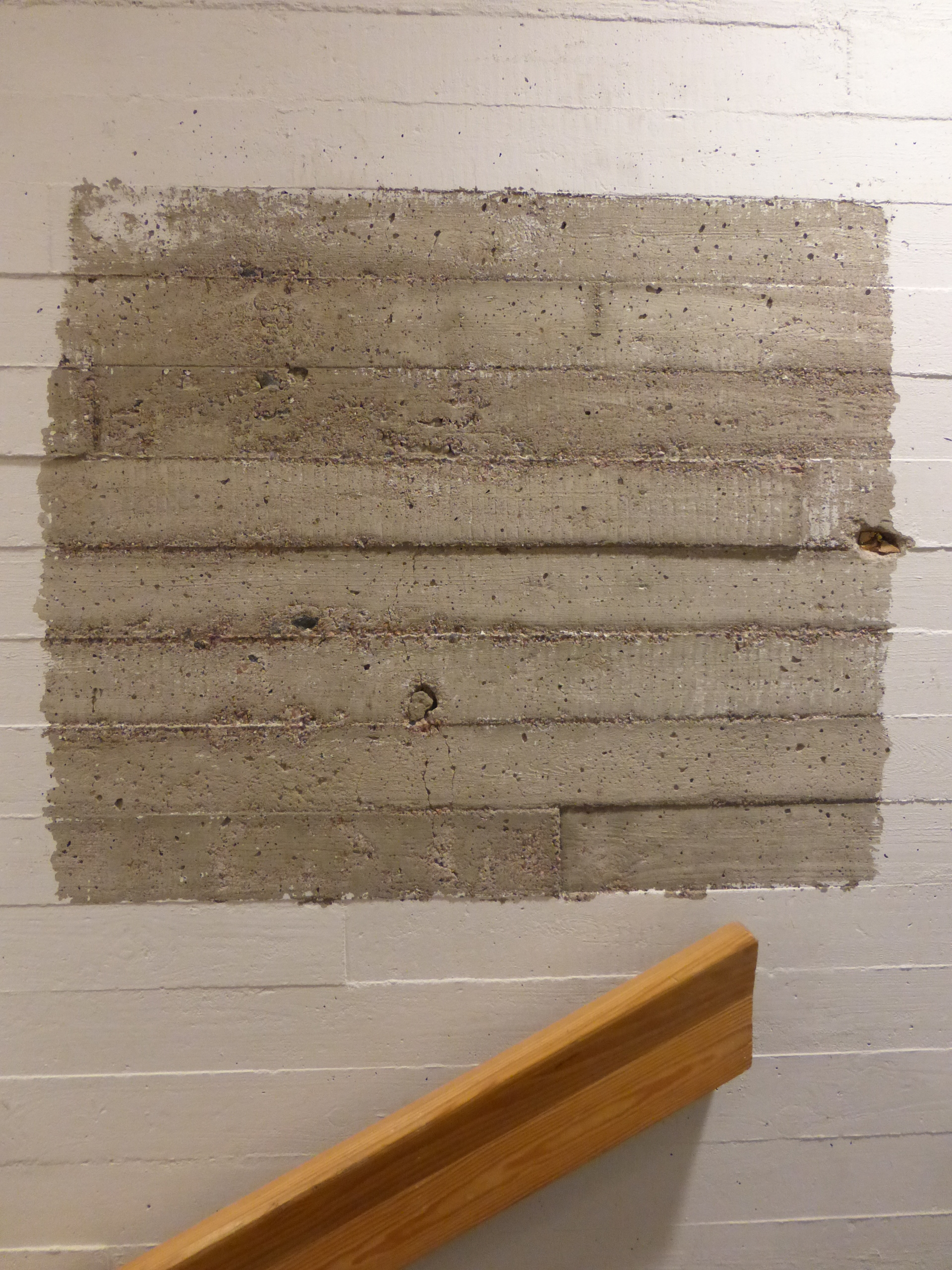 Aiemmin tehdyt remontit ovat voineet häivyttää rakennuksen luonteenomaisia piirteitä. Dipolissa muottivalupinnat oli maalattu valkoisella lateksilla (Kuva 13). Se ei käytännössä ollut poistettavissa eli muutos oli peruuttamaton. Korjauksessa maalipintaa sävytettiin lähemmäs alkuperäistä harmaata. Muutosten palautettavuus onkin yksi korjaustöissä muistettava periaate.