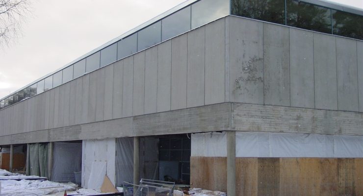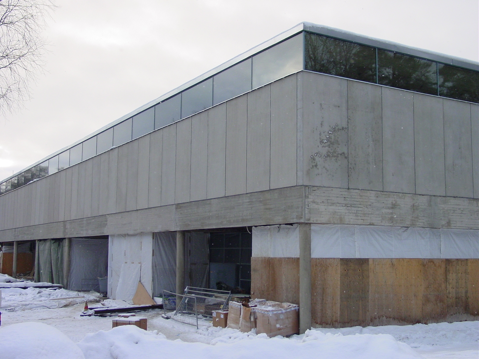 WG-painotalon ulkoseinien betonielementit uusittiin ja paikallavaletut osat kunnostettiin kun rakennus muutettiin museokäyttöön (Kuva 14). Tärkeää oli sekä säilyttää pelkistetyn julkisivun mitta- ja suhdemaailman tasapaino että löytää toimiva tekninen ratkaisu. Suunnittelija myös huolellisesti haki uusittaville betonielementeille oikeaa värisävyä. Hienovaraisuus oli tarpeen ”yllättävissä” kohdissa.