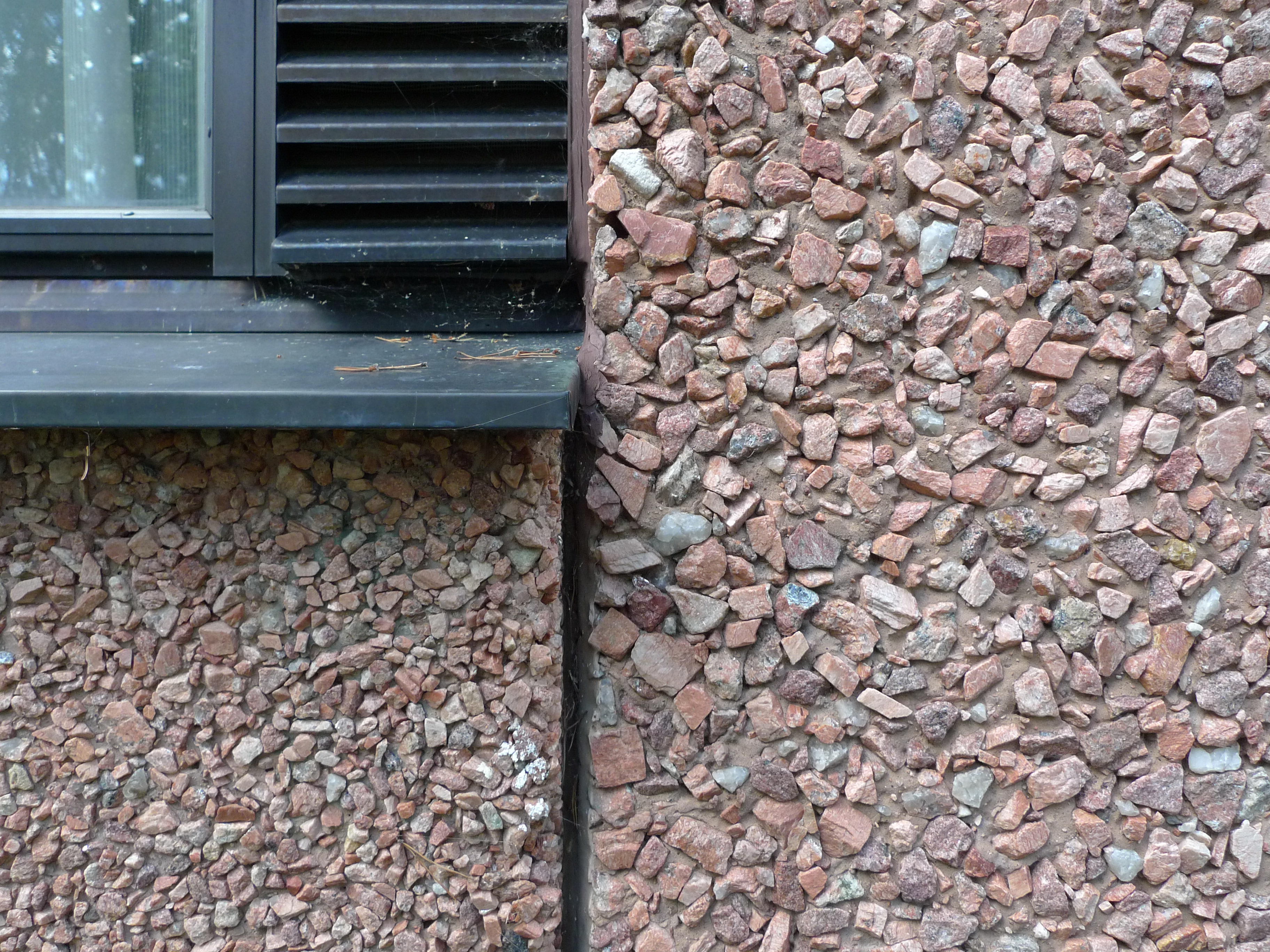 Hanaholmenin päärakennuksen peruskorjauksessa osa julkisivuelementeistä jouduttiin uusimaan. Arkkitehtuurin luonteen säilyttämiseksi pesubetonin pinnan kivilaatu ja raekoko toteutettiin mahdollisimman tarkasti alkuperäistä seuraten (Kuva 16).