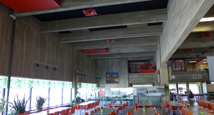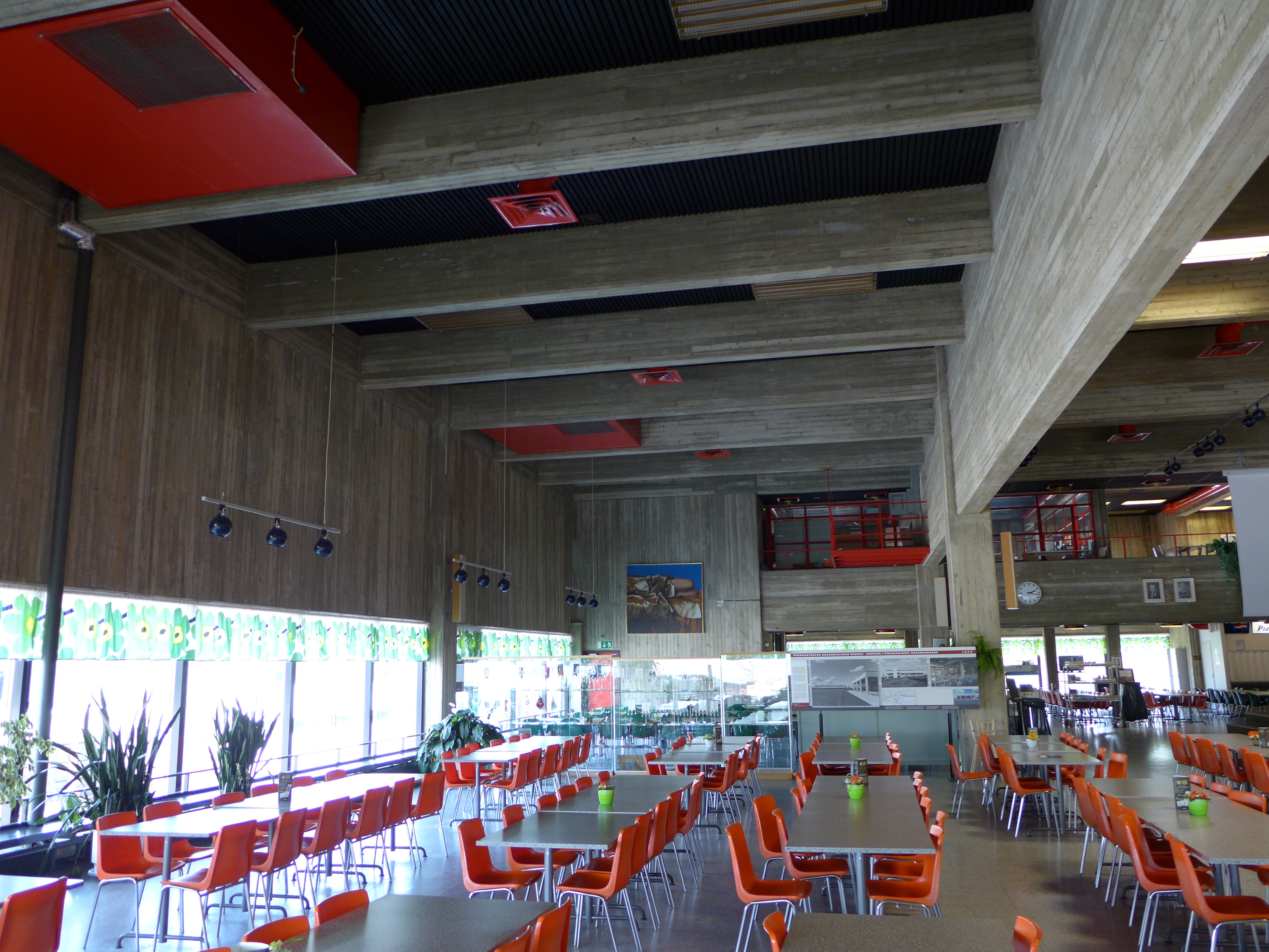 Rakenteiden paljaat betonipinnat, näkyviin jätetyt kirkkaanpunaiseksi maalatut tekniset asennukset ja oranssinpunaiset muovituolit määrittelevät olennaisesti Vekaranjärven sotilaskodin sisätiloja (Kuva 17). Arkkitehtuuri on huoliteltua ja osoittautunut tarkoituksenmukaiseksi ja kestäväksi. Hienostelemattomat materiaalit ja erillisten sisustuselementtien puuttuminen ovat arkkitehtuurin luonteen säilymisen avainkysymyksiä.