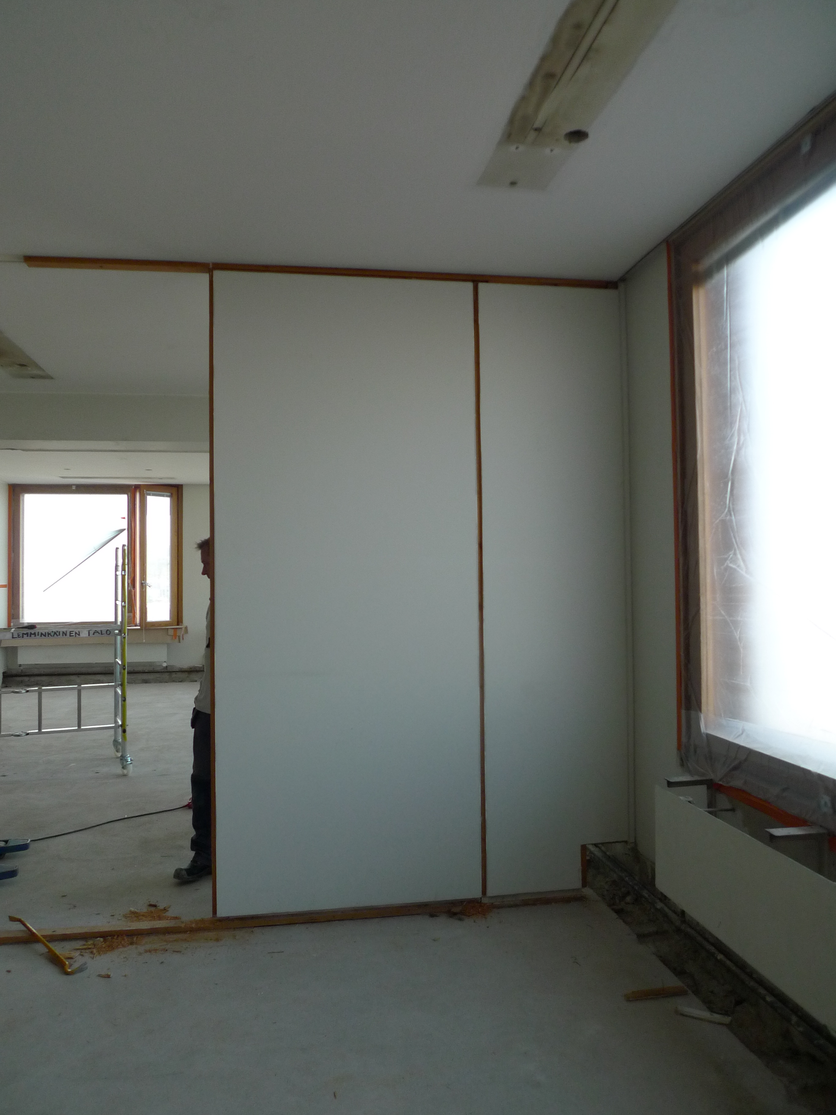 Enson pääkonttorissa alkuperäinen väliseinäratkaisu oli tilojen muunneltavuuden vuoksi suunniteltu ja toteutettu siten, että seinä olisi purettavissa osiin ja koottavissa toiseen paikkaan (Kuvat 21 & 22). 50 ensimmäisen käyttövuoden aikana ominaisuutta ei tiedetä hyödynnetyn.