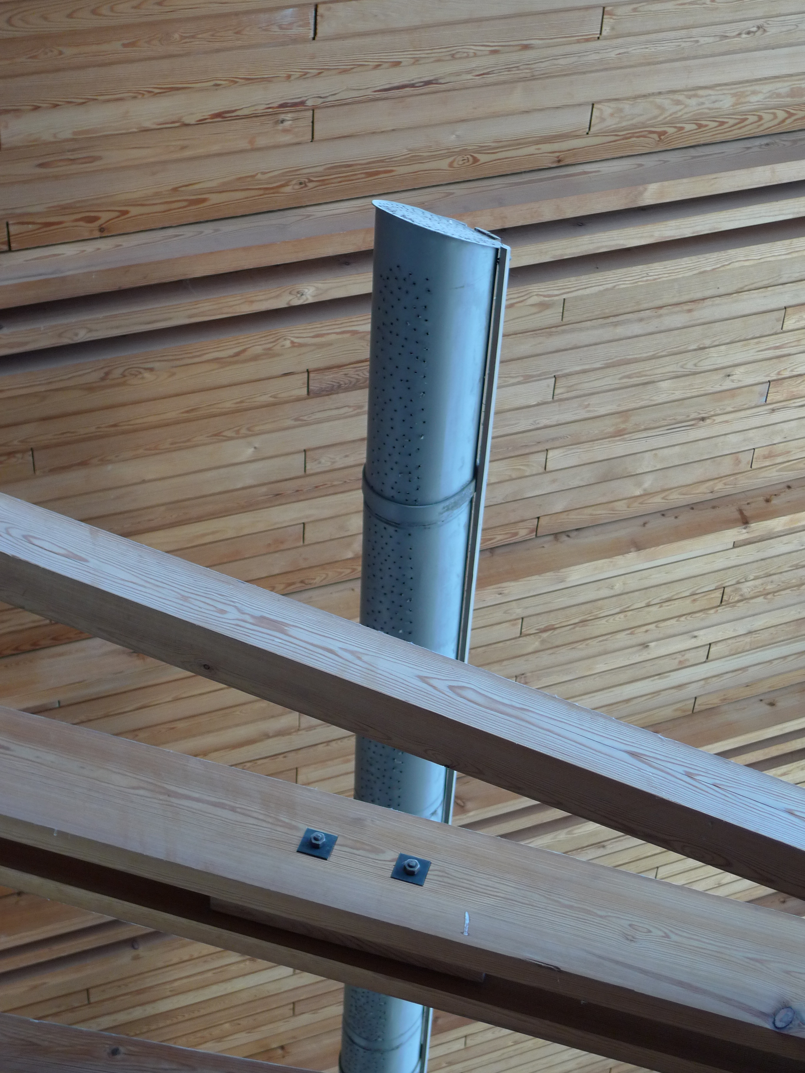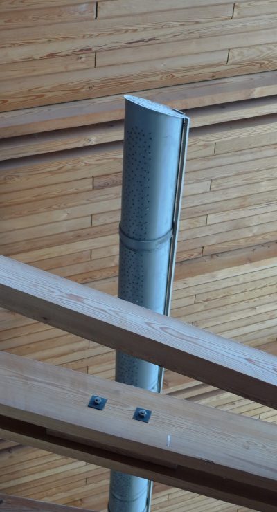 Jyväskylän Seminaarinmäen Lozzi -ravintolarakennukseen toteutettiin jo alun perin 1950-luvulla koneellinen ilmanvaihto. Raitis ilma jaetaan ravintolasaliin työmaalla rei´itetyn peltiputken kautta (Kuva 22). Peruskorjauksessa näitä alkuperäisiä osia säilytettiin osana toimivaa järjestelmää.