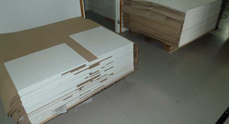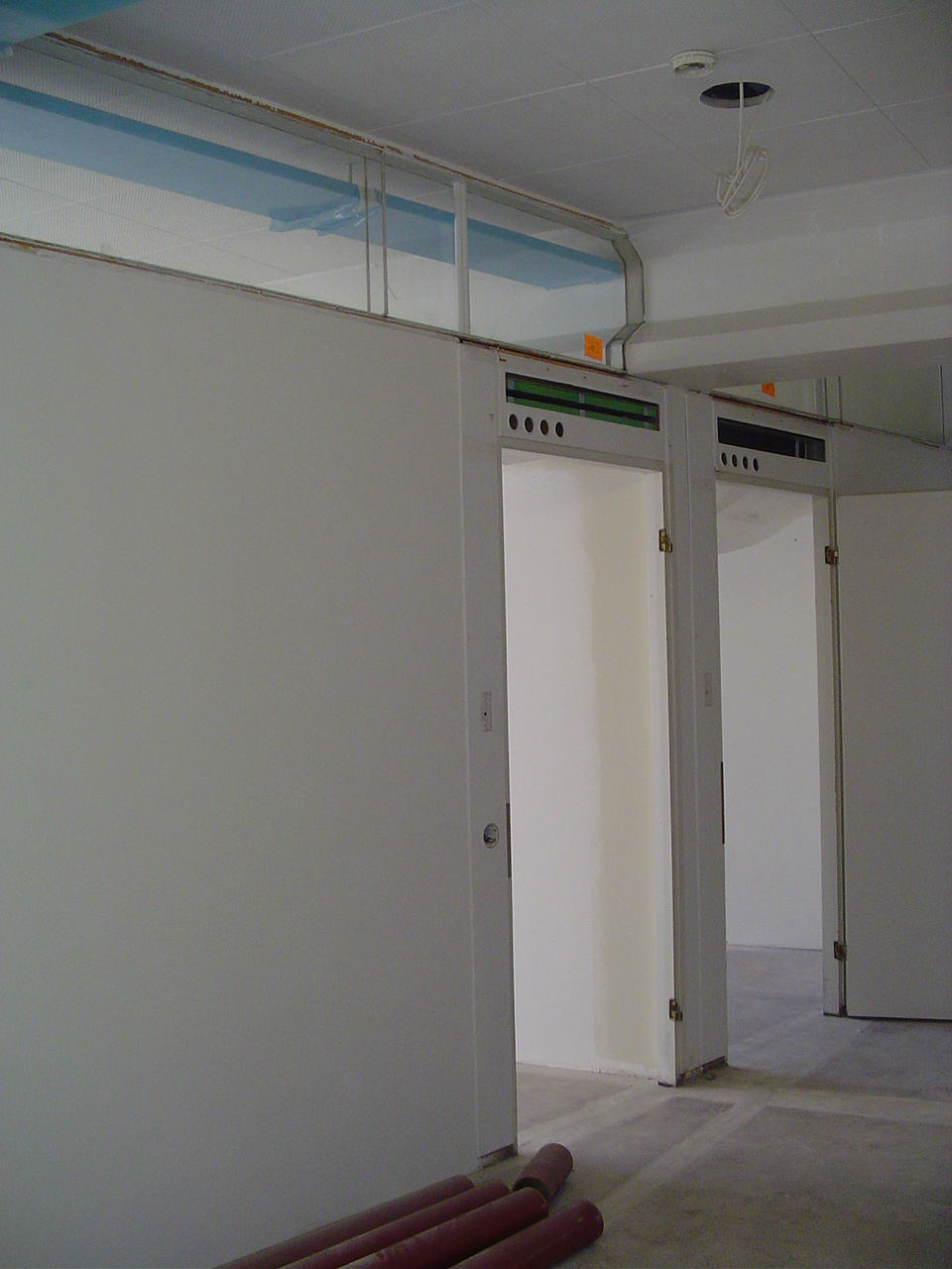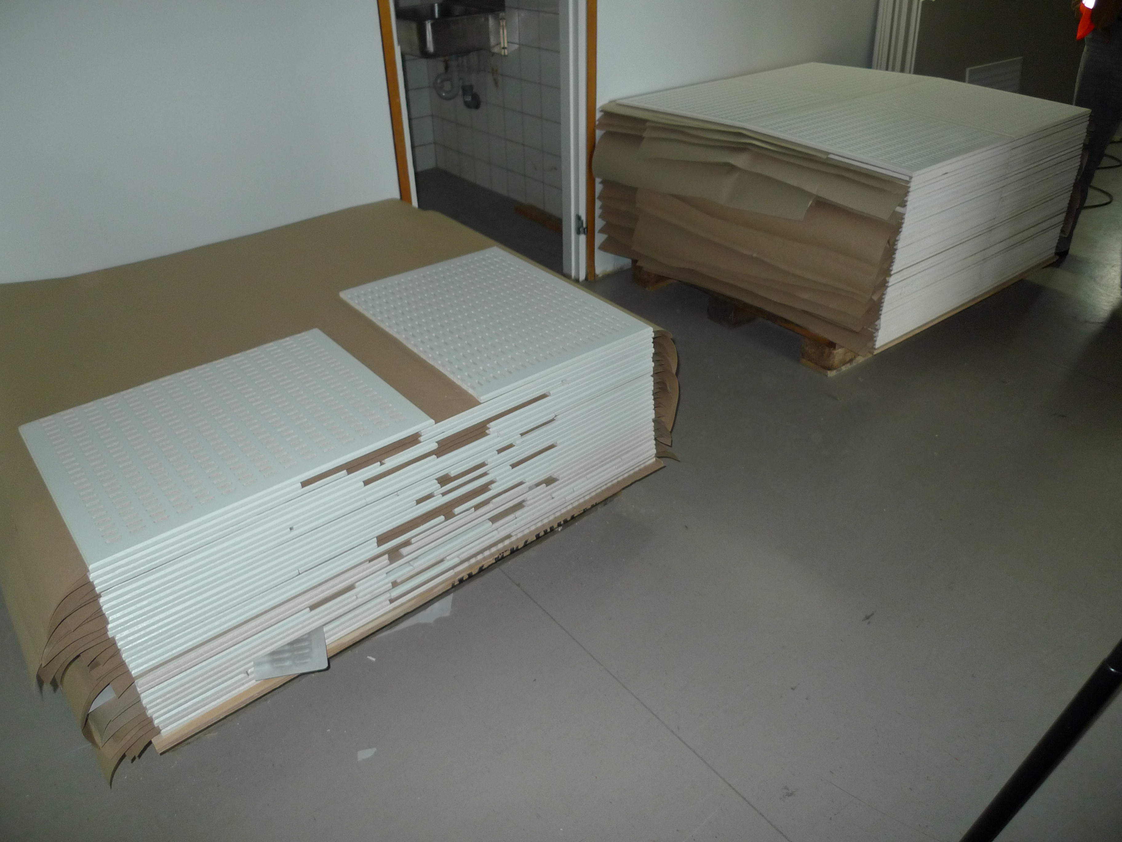 Enson pääkonttorirakennuksen toimistokäytävien alakatot suunniteltiin jo alkujaan helposti avattavaksi ja uusittavaksi, jotta yläpuolisia teknisiä järjestelmiä päästään huoltamaan ja korjaamaan tarvittaessa. Kipsisten levyjen erityinen rei´itystapa oli helpoin säilyttää irrottamalla levyt ja varastoimalla levyt varovasti (Kuva 10). Talotekniikka-asennusten jälkeen ne voitiin palauttaa vahingoittumattomina paikoilleen alkuperäisenä säilytettyyn alakaton runkoon.