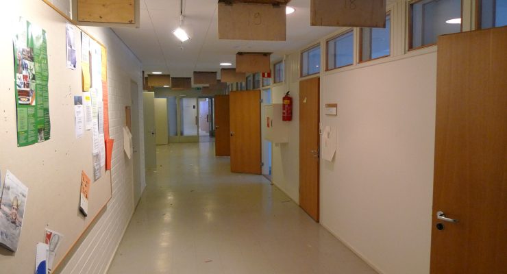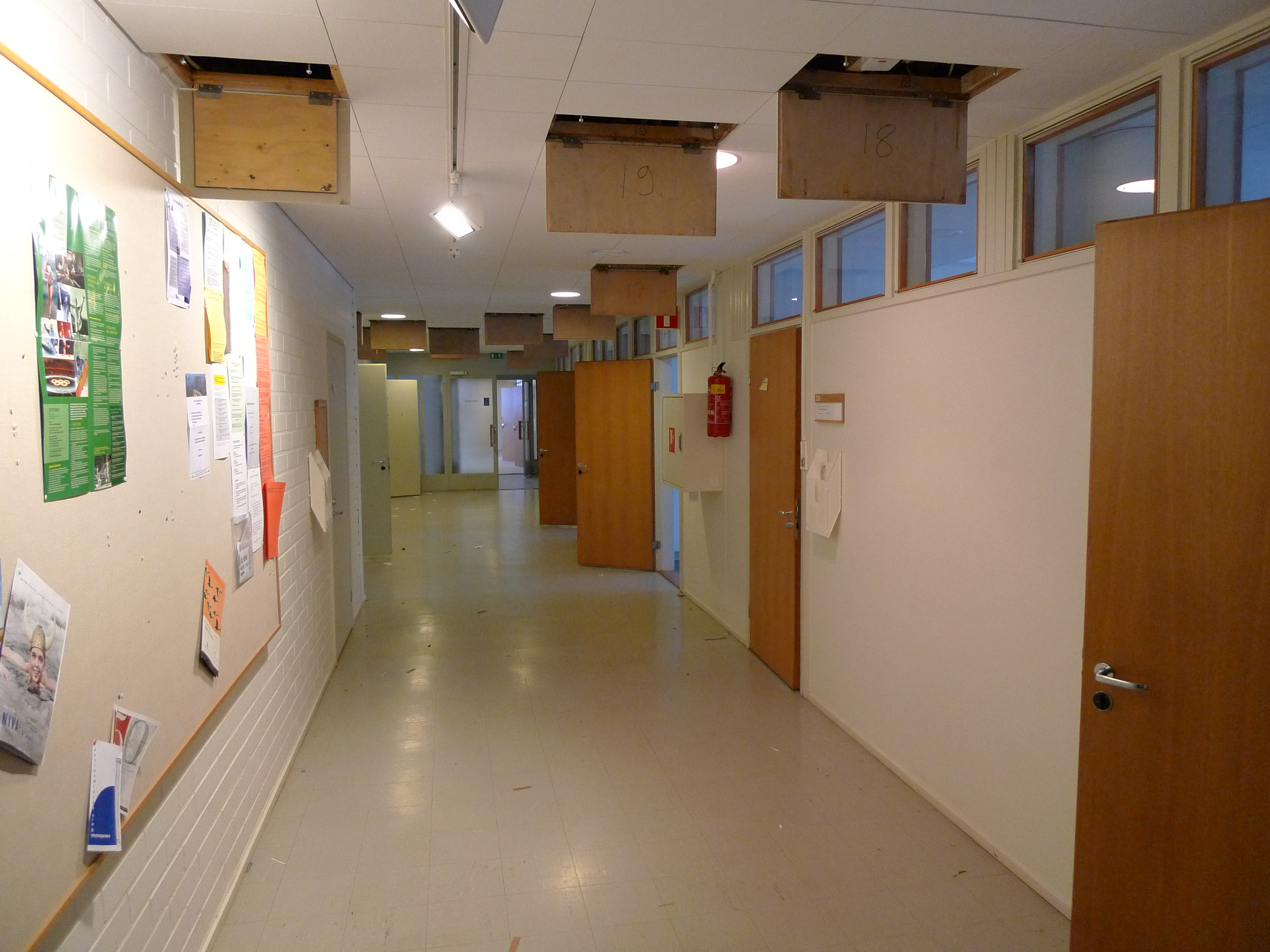 Uudet tekniset järjestelmät harvoin sopivat vanhoihin raameihin. Alkuperäisen tekniikan väistyessä tilojen ilme usein muuttuu. Porthaniassa rakenteet, rakennusosat ja talotekniikka oli nivottu tarkasti yhteen (Kuva 25). Ilmanvaihdon toimintaperiaate pidettiin ennallaan ja tiukasta mitoituksesta huolimatta uudet järjestelmät saatiin sovitettua huoneisiin käytävänäkymän pysyessä lähes entisellään. Muutosvaran niukkuus ei johtanut muutosvaaraan.