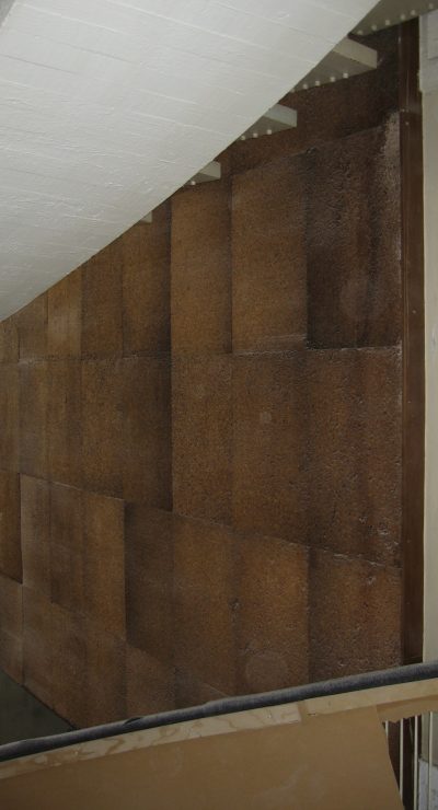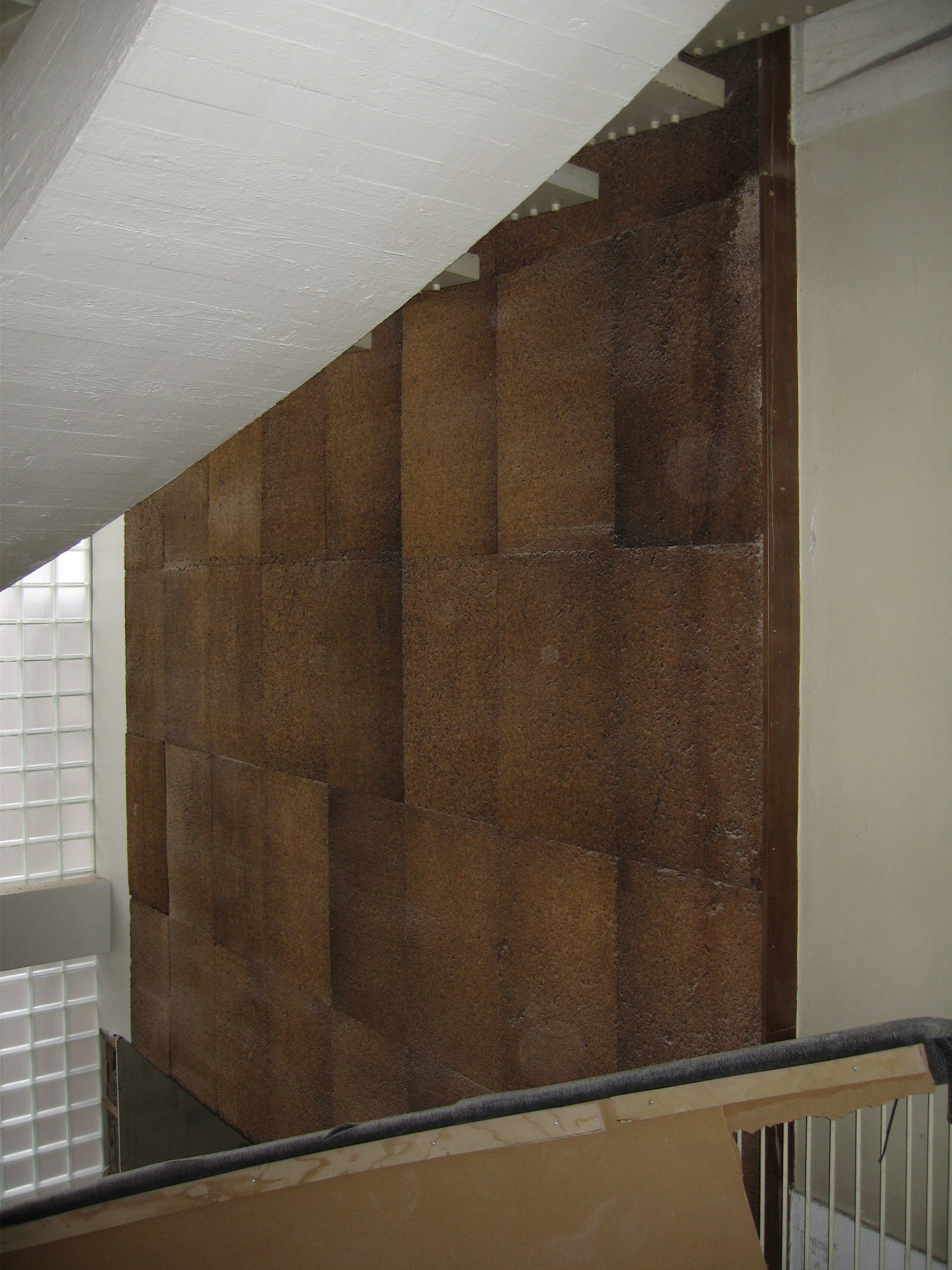Porthanian pääaulan lasitiiliseinä uusittiin, koska tiilet olivat rikki (Kuva 5). Viereisen korkkiseinän ikääntyneisyys korostui, kun ympäröivät pinnat kunnostettiin tai uusittiin. Keskusteltiin patinan ja lian erosta. Korkkiseinä puhdistettiin hienovaraisesti patina säilyttäen.