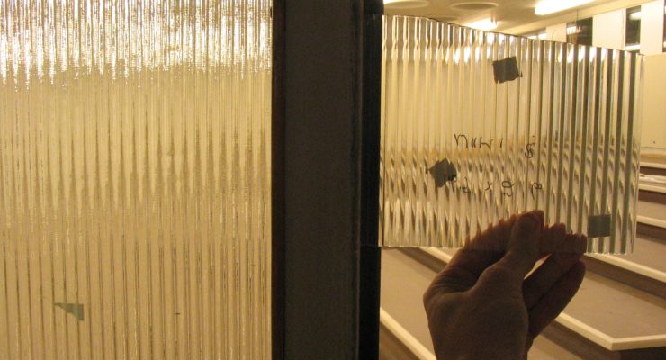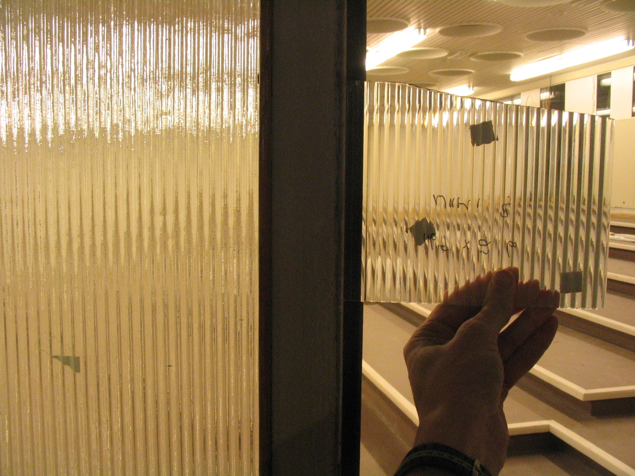 Yksi Porthanian luentosalin lasiseinän ruuduista oli rikki. Sen tilalle löydettiin markkinoilta lasituote, joka oli riittävän lähellä alkuperäistä (Kuva 7). Sopivan materiaalin etsiminen vaatii usein sitkeyttä.