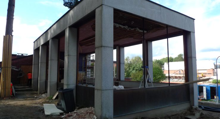 Modernin arkkitehtuurin ilme syntyy tyypillisesti teollisesti valmistettujen osien toistosta ja yhteensopivuudesta. Osat on usein ajateltu ajoittain uusittavaksi ja valmistettu huokeista materiaaleista. Kun peruskorjauksessa aluksi puretaan uusittavat osat ja järjestelmät, voi käydä niin, että jäljelle jää merkityksistäänkin riisuttu paljas runko. Jyväskylän yliopiston Lyhdyn julkisivuista suuri osa on lasia. Rakennuksen korjaustöiden ajaksi ikkunat irrotettiin kunnostettavaksi. (Kuva 1)
