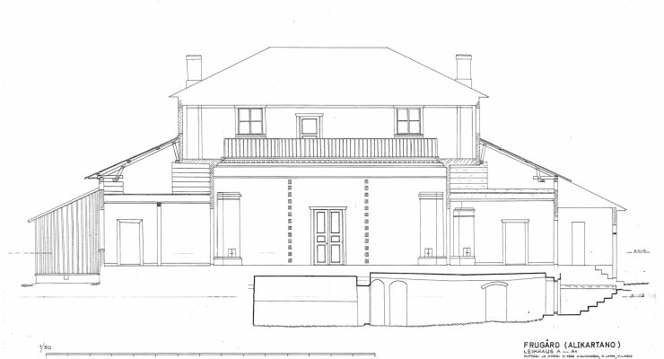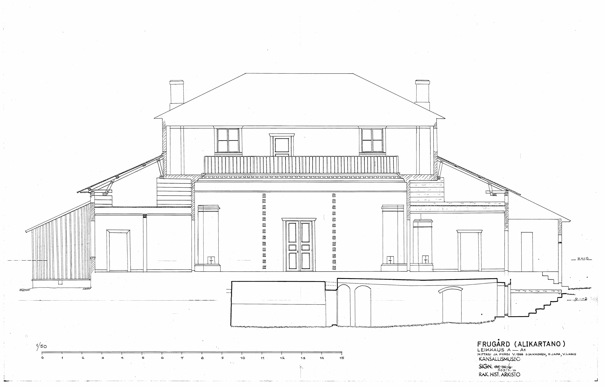 Mäntsälän Frugård eli Alikartano. Mittausdokumentointityön tuotoksena syntynyt leikkaus vuodelta 1968. Piirros: S. Saikkonen, E. Jama, V. Laine. Kuva: Museoviraston Kulttuuriympäristöpalvelut, Restaurointiyksikkö.