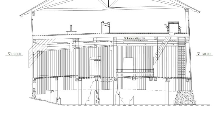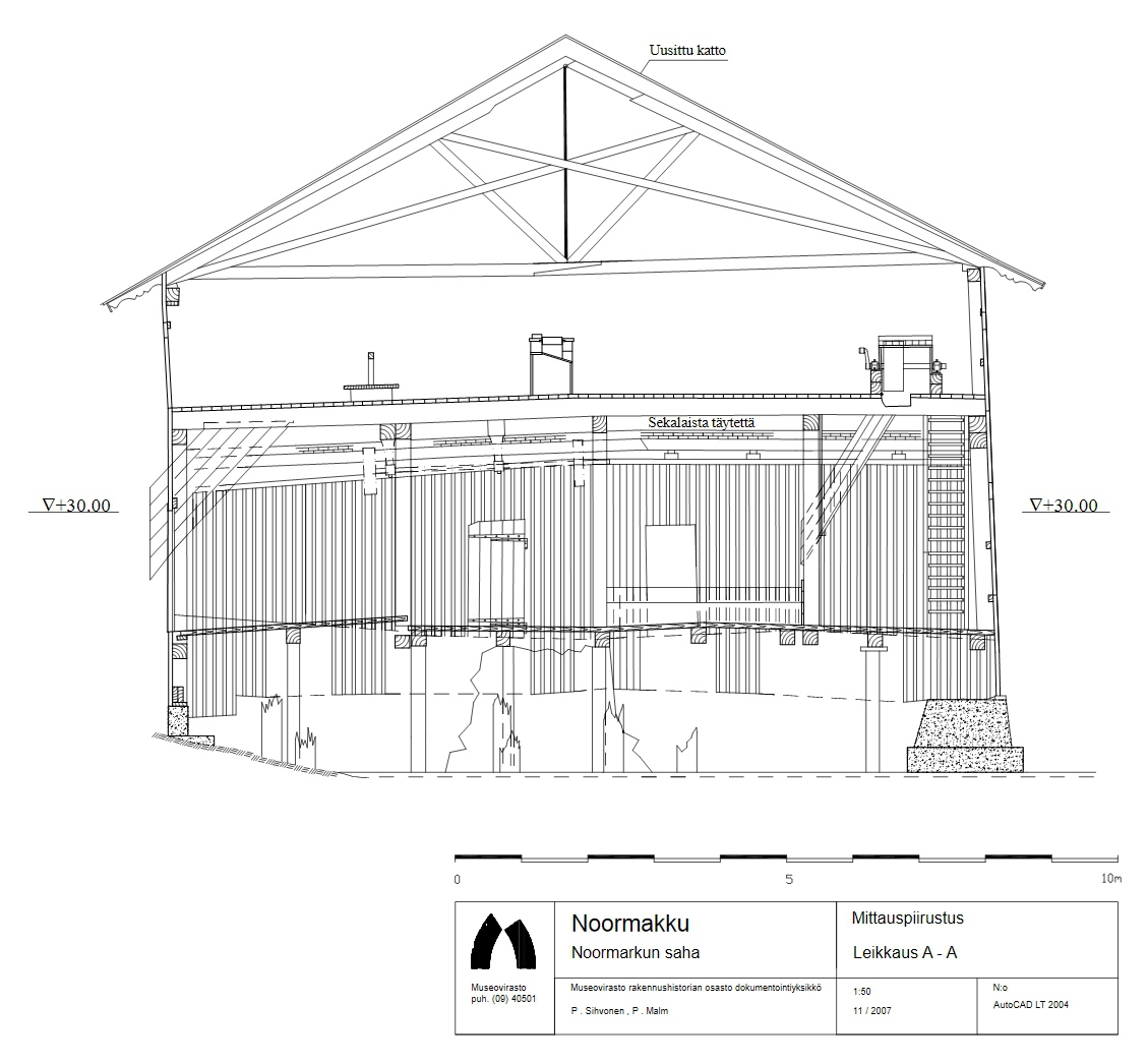 Teollisuuden rakennukset tulivat Muinaistieteellisen toimikunnan katseen alle itsestään selvien rakennusmuistomerkkien jälkeen. Kuvassa Noormarkun sahan leikkaus. Piirros: Pekka Sihvonen ja Pertti Malm, Museovirasto restaurointiyksikkö.