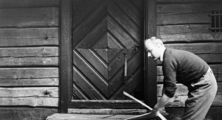 Piirtäjä Eero Jama työssään dokumentoimassa Kiskon Mommolan kartanoa 1968. Kuva: Elias Härö, Museovirasto (RHO469645).
