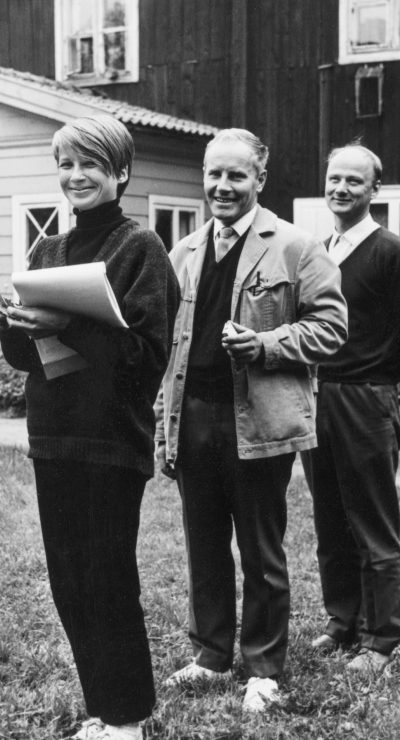 Tutkijat Hanna Kronlöf ja Elias Härö sekä piirtäjä Eero Jama dokumentoimassa Kiskon Mommolan kartanoa vuonna 1968. Kuva: P. O. Welin, Museovirasto (RHO469647).