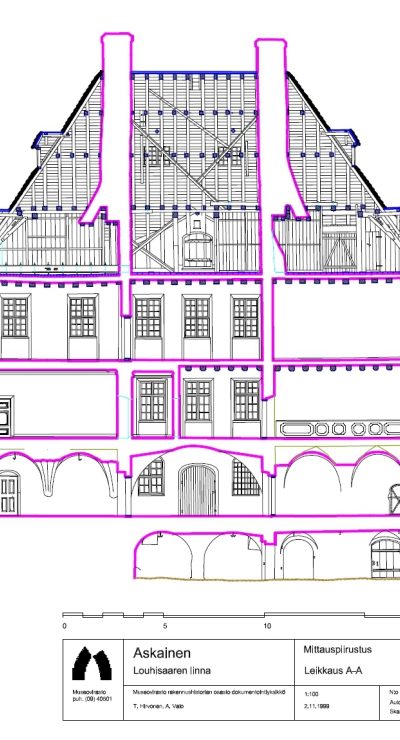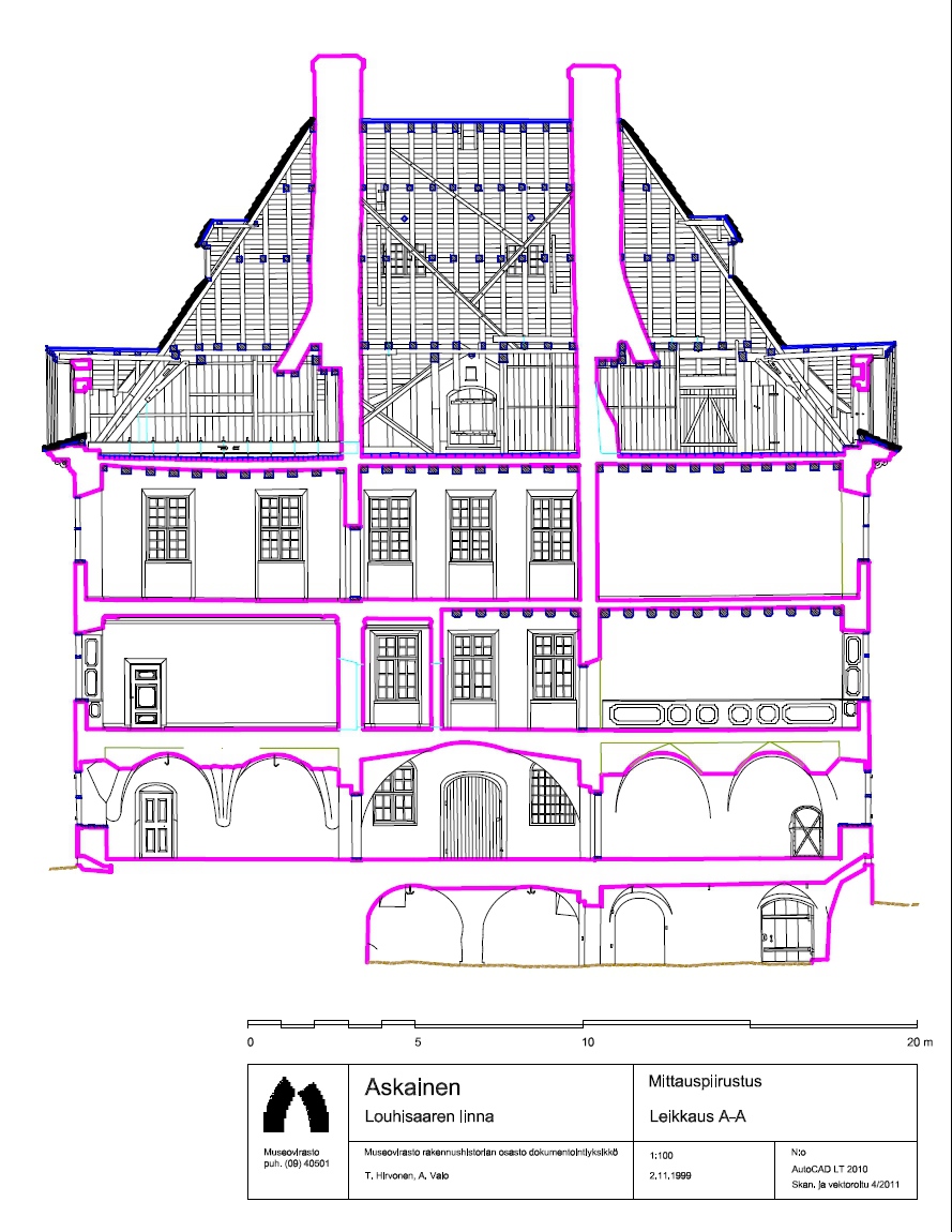 Digitaalisin välinein piirretty leikkaus Askaisten Louhisaaren linnasta vuodelta 1999. Kuva: Museoviraston kulttuuriympäristöpalvelut, restaurointiyksikkö.