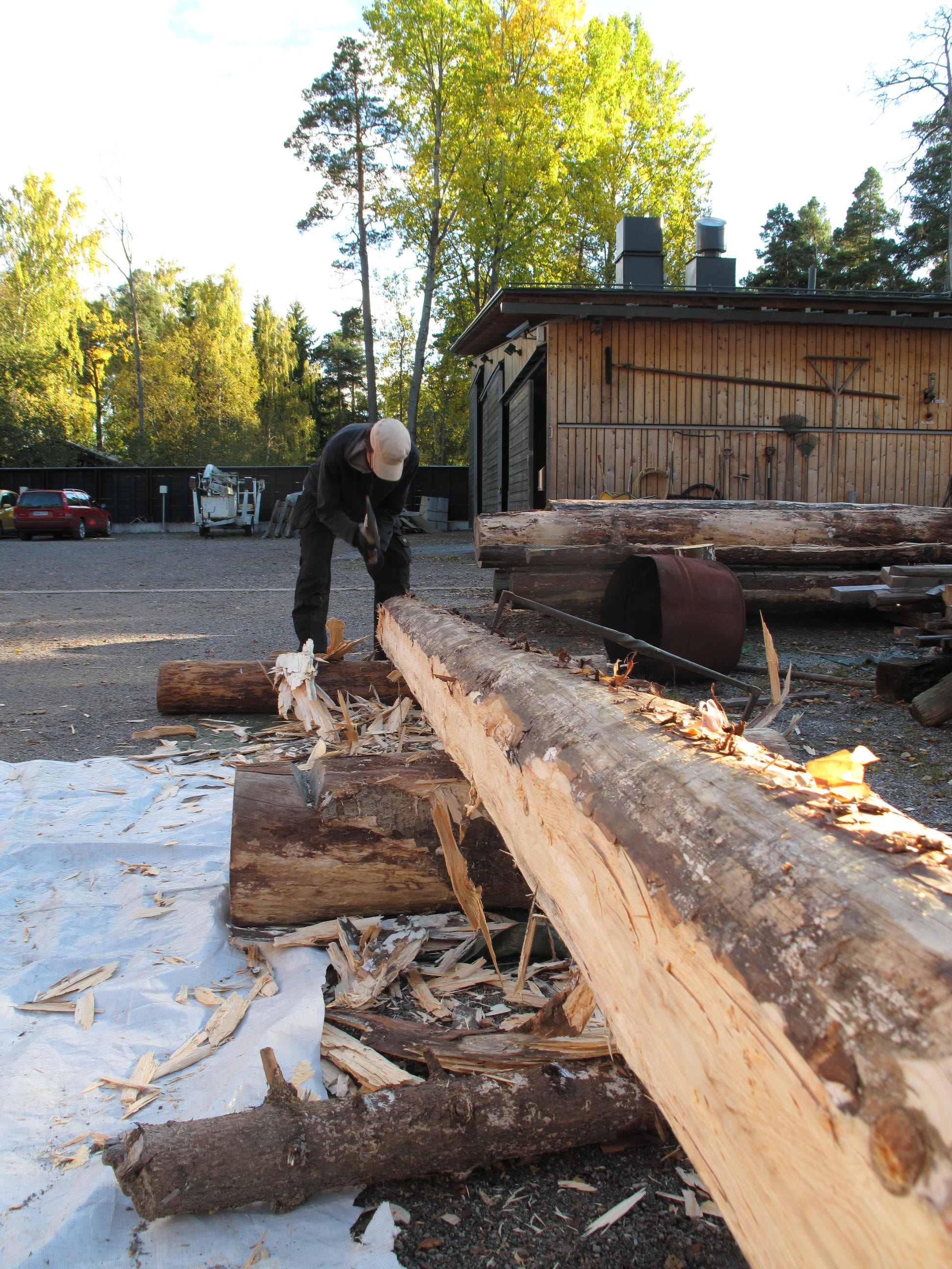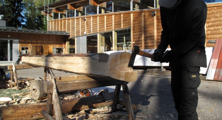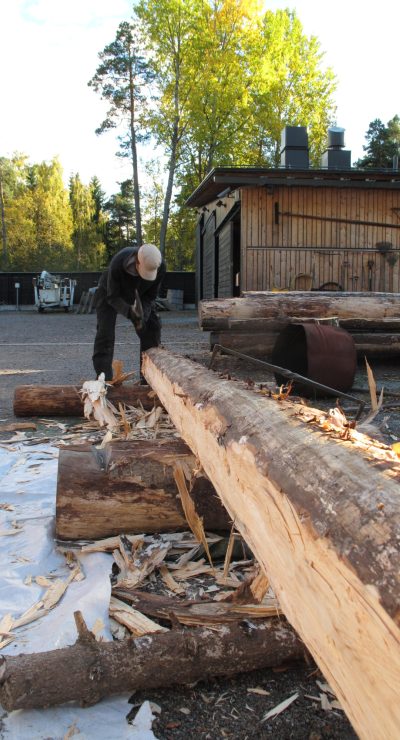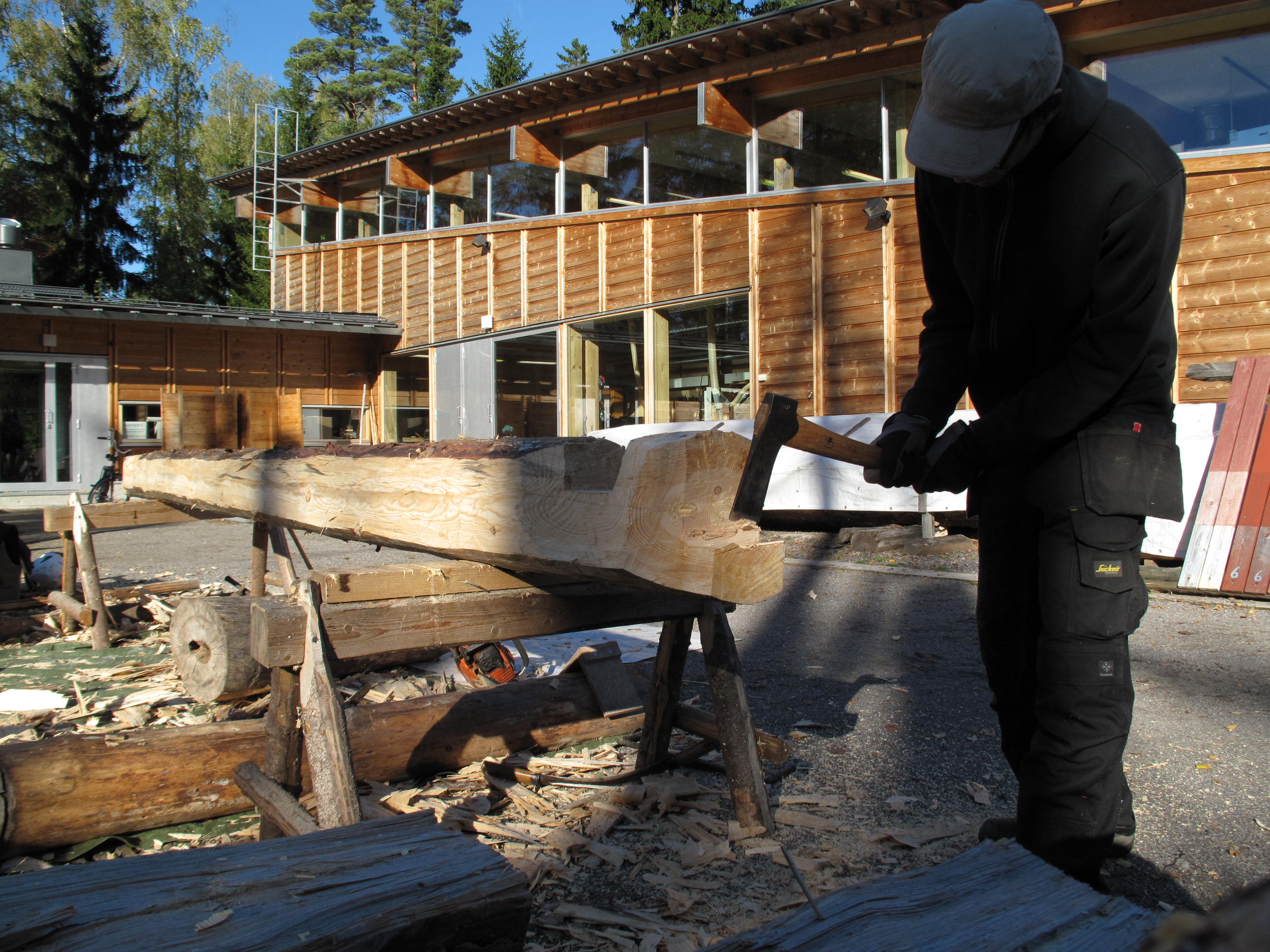 Moderneilla puuntyöstökoneilla työskentely ja pintojen viimeistely perinteisillä piilukirveillä tai käsihöylillä tuntuvat turvalliselta toimivassa työympäristössä. Kuva: Jukka Mähönen.