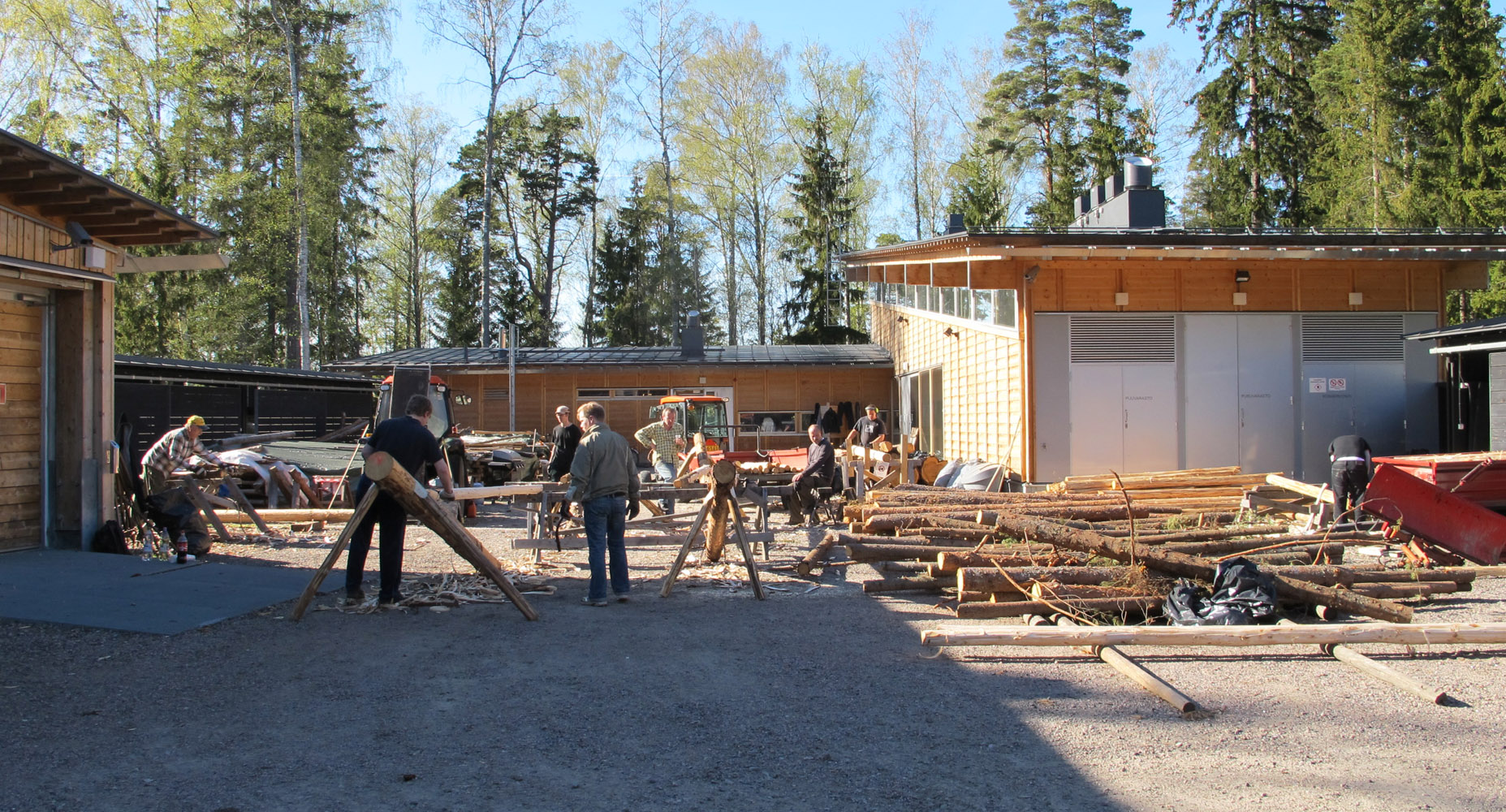 Suljettu pihapiiri mahdollistaa tekijöilleen tilavan turvallisen työympäristön, jossa on mahdollista järjestää vaikka puunkuorintatalkoita. Kuva: Jani Puhakka.