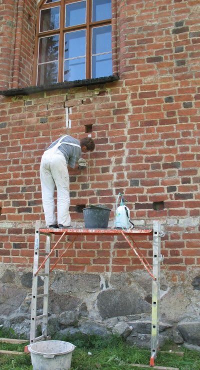 Hattulan Pyhän Ristin kirkon ulkoseinän korjaus 2007. Kuva: Anu Laurila.