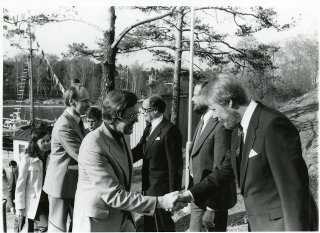 Samana vuonna kun ensimmäinen museopoliittinen ohjelma valmistui, avattiin myös Museoviraston alaisen Suomen Merimuseon ensimmäinen pysyvä näyttely Hylkysaaressa Helsingissä, vanhassa luotsikasarmissa, jonka Merenkulkulaitos tarjosi vuonna 1964 merimuseorakennukseksi. Vuonna 2007 Suomen merimuseo muutti uusiin toimitiloihin Kotkaan Merikeskus Vellamoon. Museoviraston tutkimusosaston johtaja Torsten Edgren kättelee ministeri Kalevi Kivistöä. Kuva: Timo Syrjänen, Suomen merimuseo (SMK90047:5), CC BY 4.0.