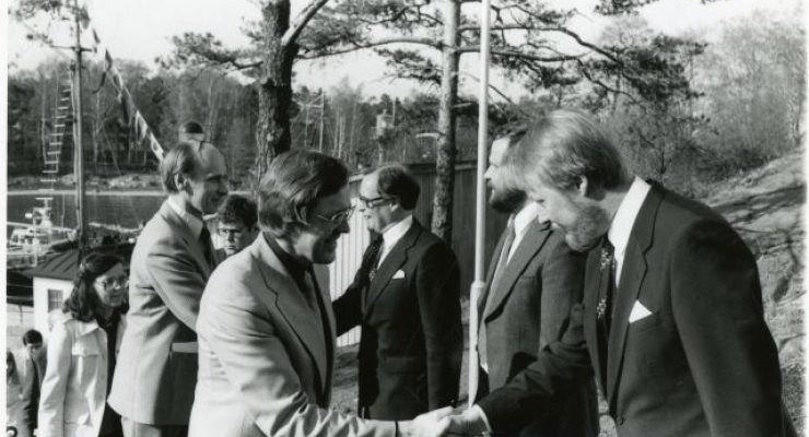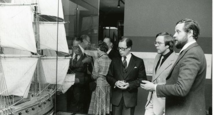 Kuvassa Museoviraston ylijohtaja C.J. Gardberg (vas.), ministeri Kalevi Kivistö ja merihistorian toimiston päällikkö Risto Halme. Kuva: Timo Syrjänen, Suomen merimuseo (SMK90047:22), CC BY 4.0.