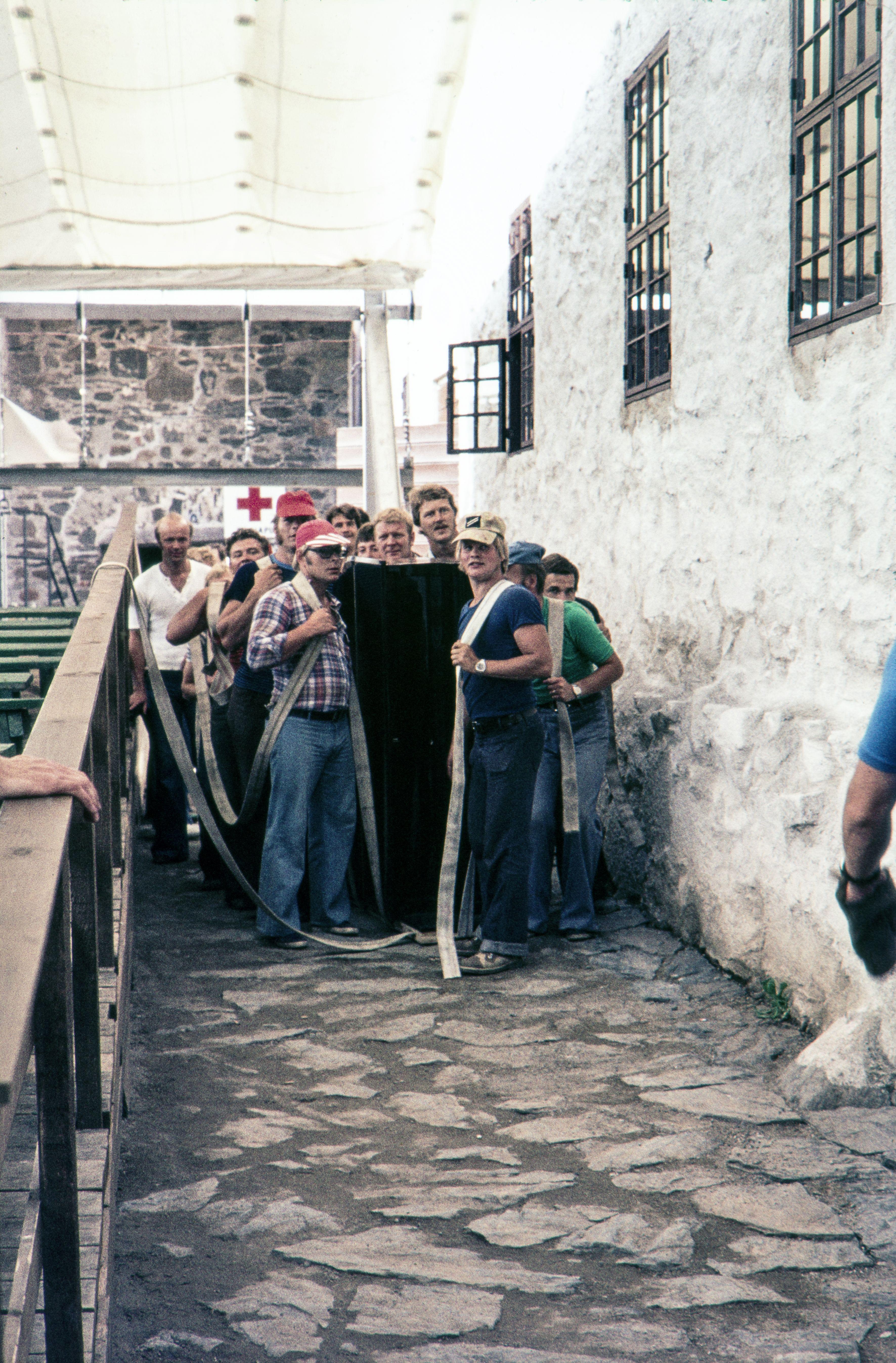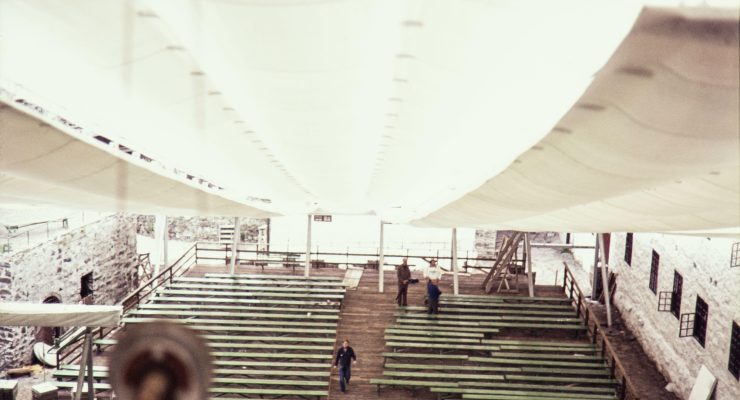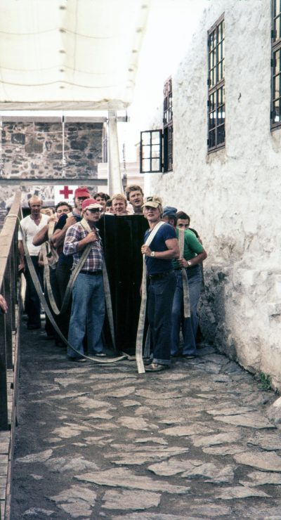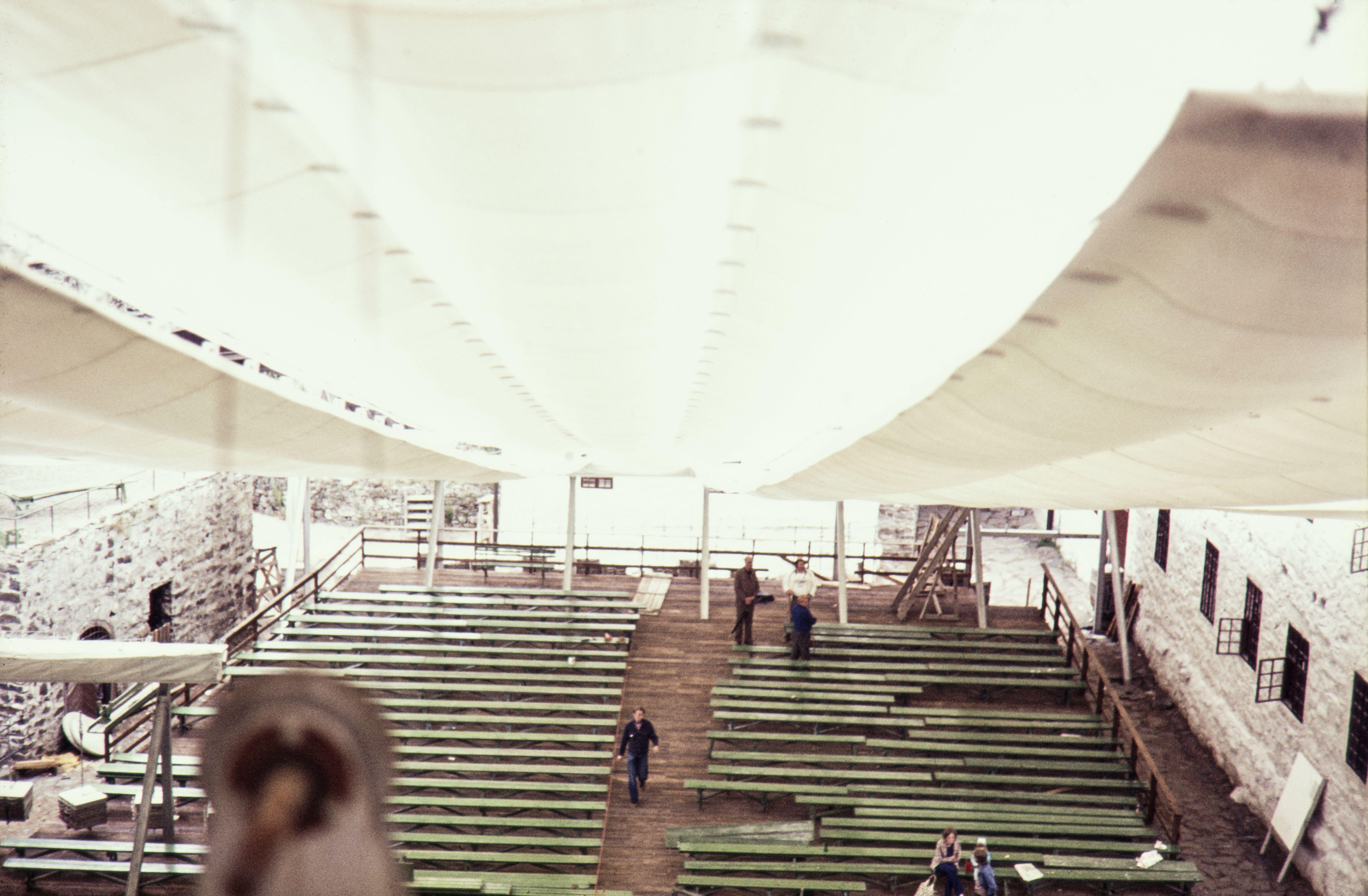 Olavinlinnan 500-vuotisjuhlallisuuksiin valmistaudutaan linnanpihaa kattamalla ja istuimia pystyttämällä. Kuva: Museovirasto (RHO469672).