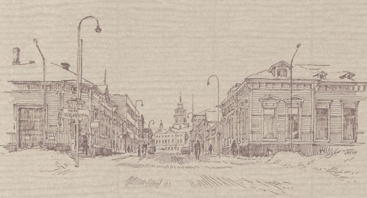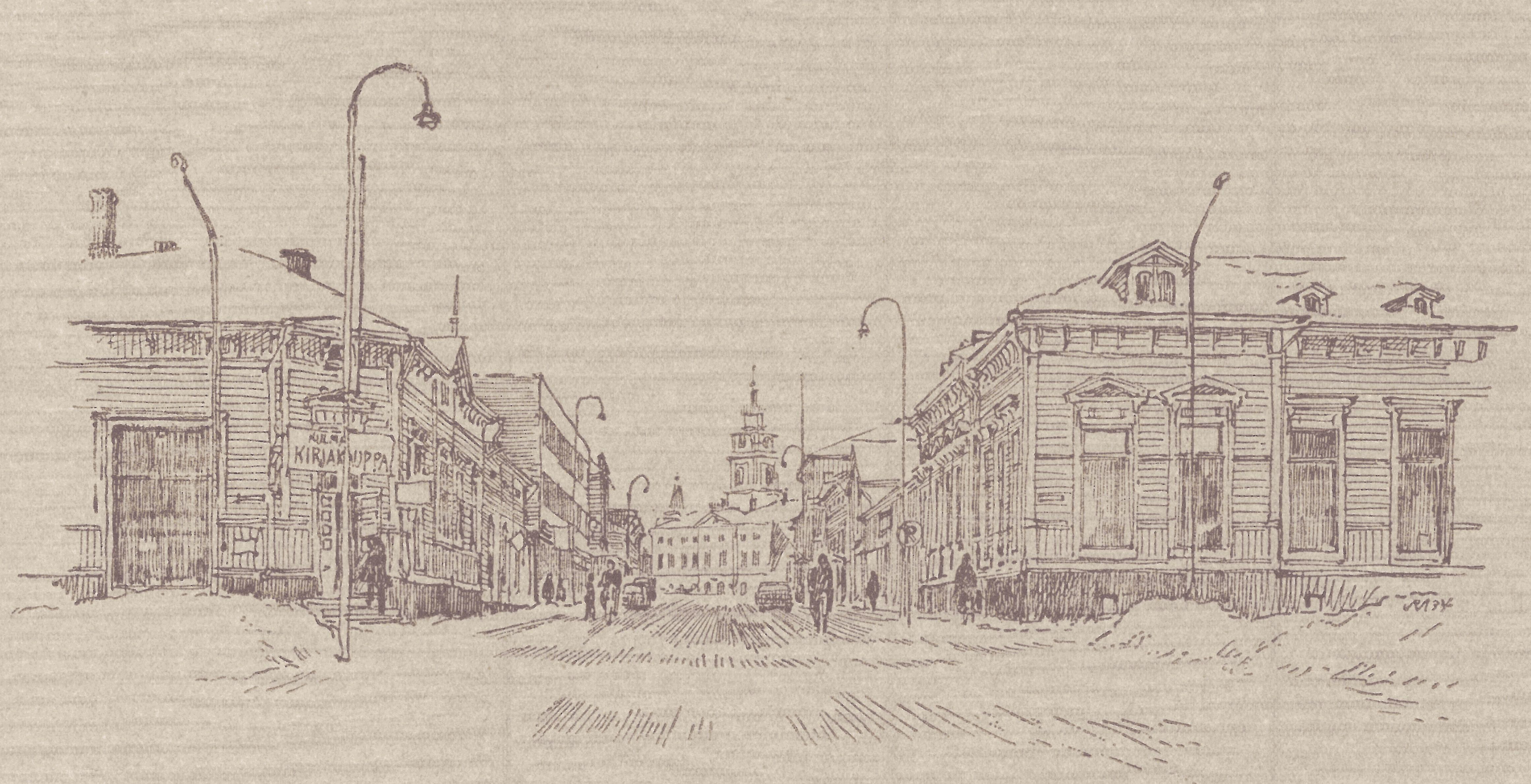 Rakennussuojelukomitean mietinnön kantta koristaa taidokas piirros puukaupunkikeskustasta. Piirros: Richard Ahlqvist.
