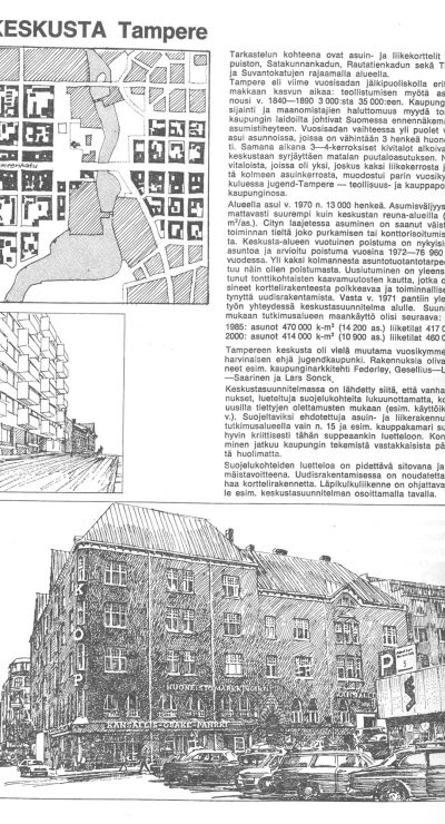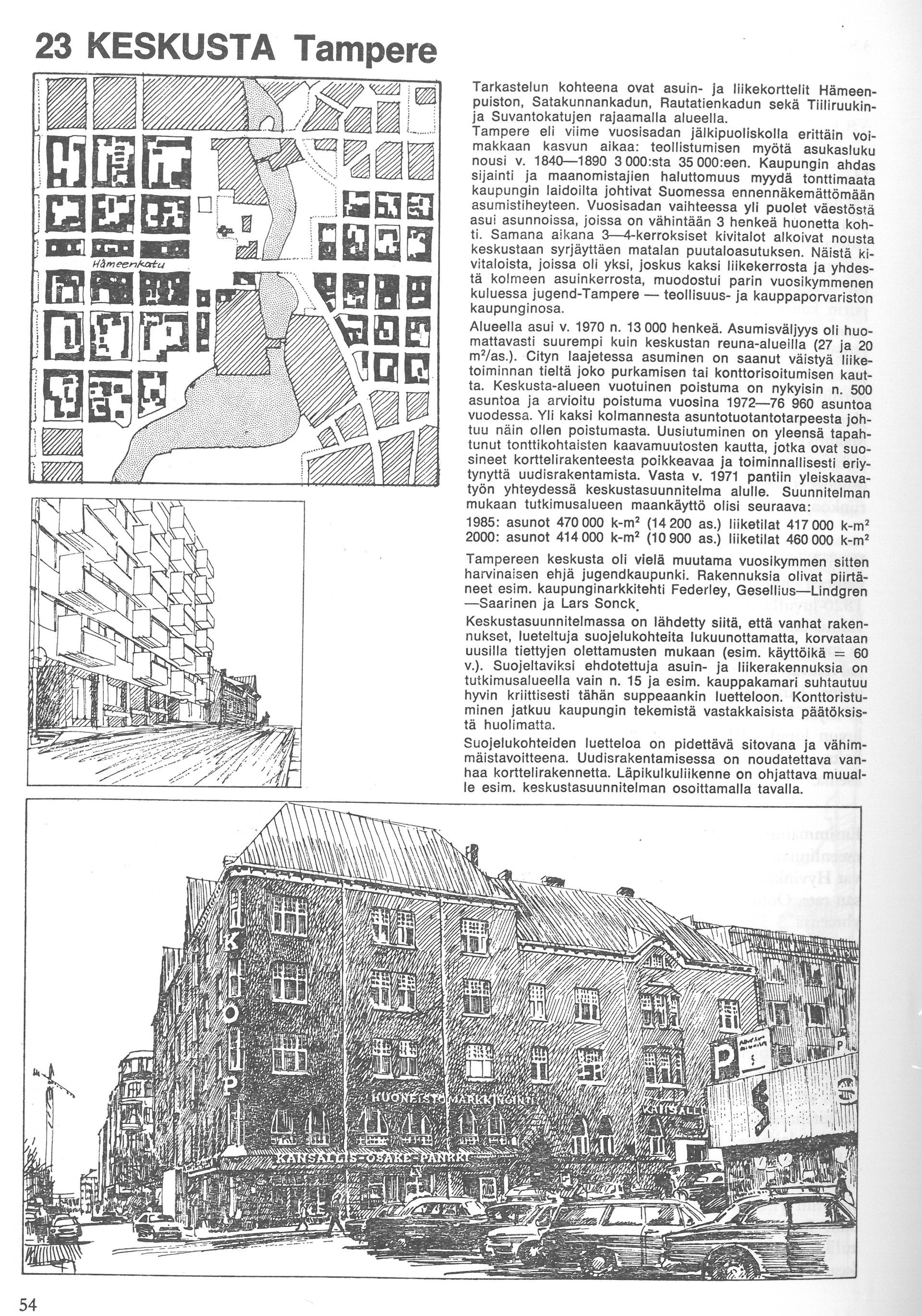Tampereen keskusta. Skannaus Komiteamietinnön sivun 54 tekstistä ja kuvituksesta.