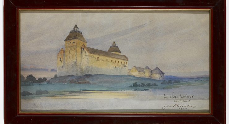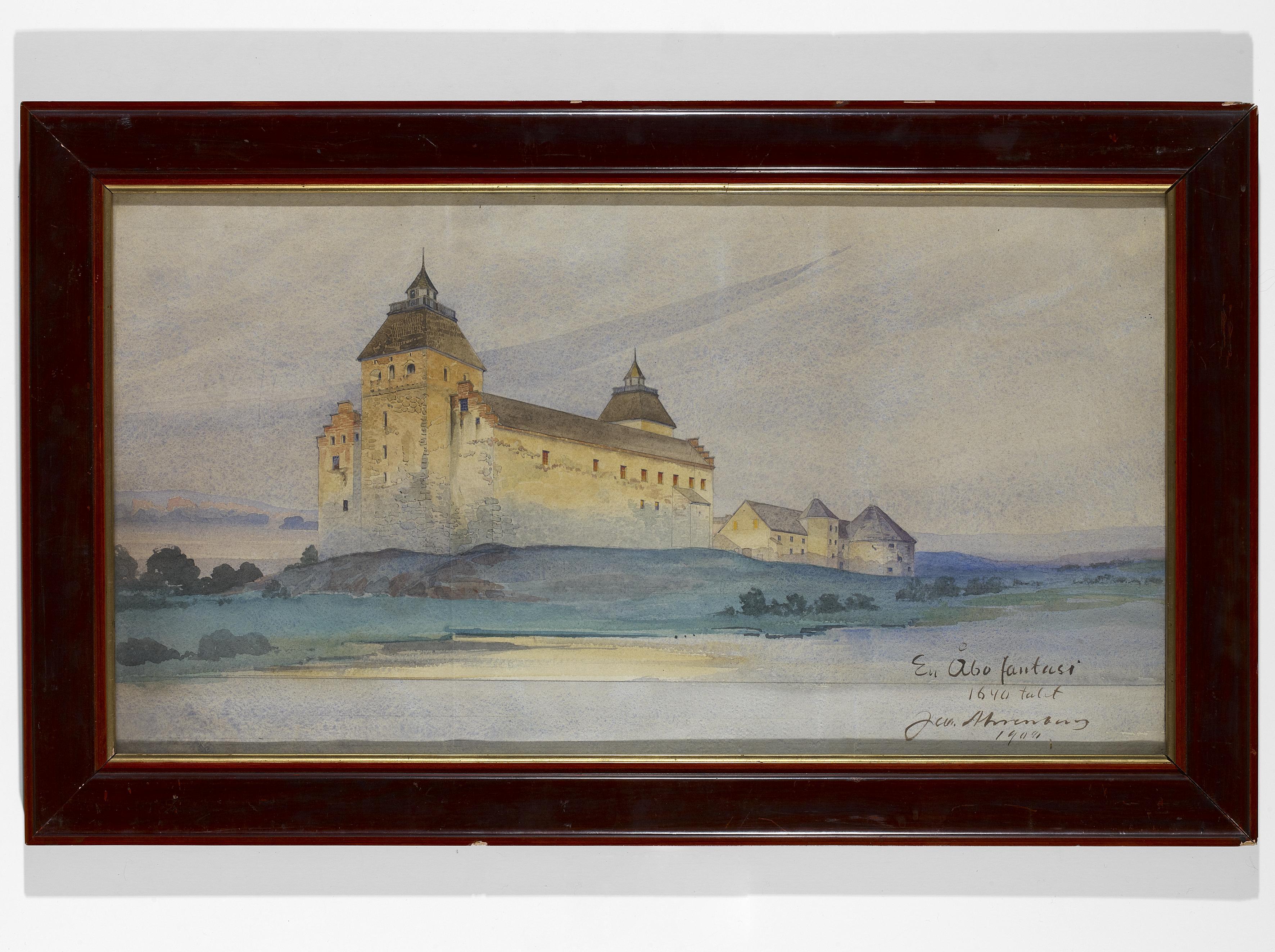 Arkkitehti Jac. Ahrenbergin 1640-lukua tavoitteleva akvarelli Turun linnasta "En Åbo fantasi 1640-talet" vuodelta 1909. Kuva: Museovirasto, (HK6867:1).