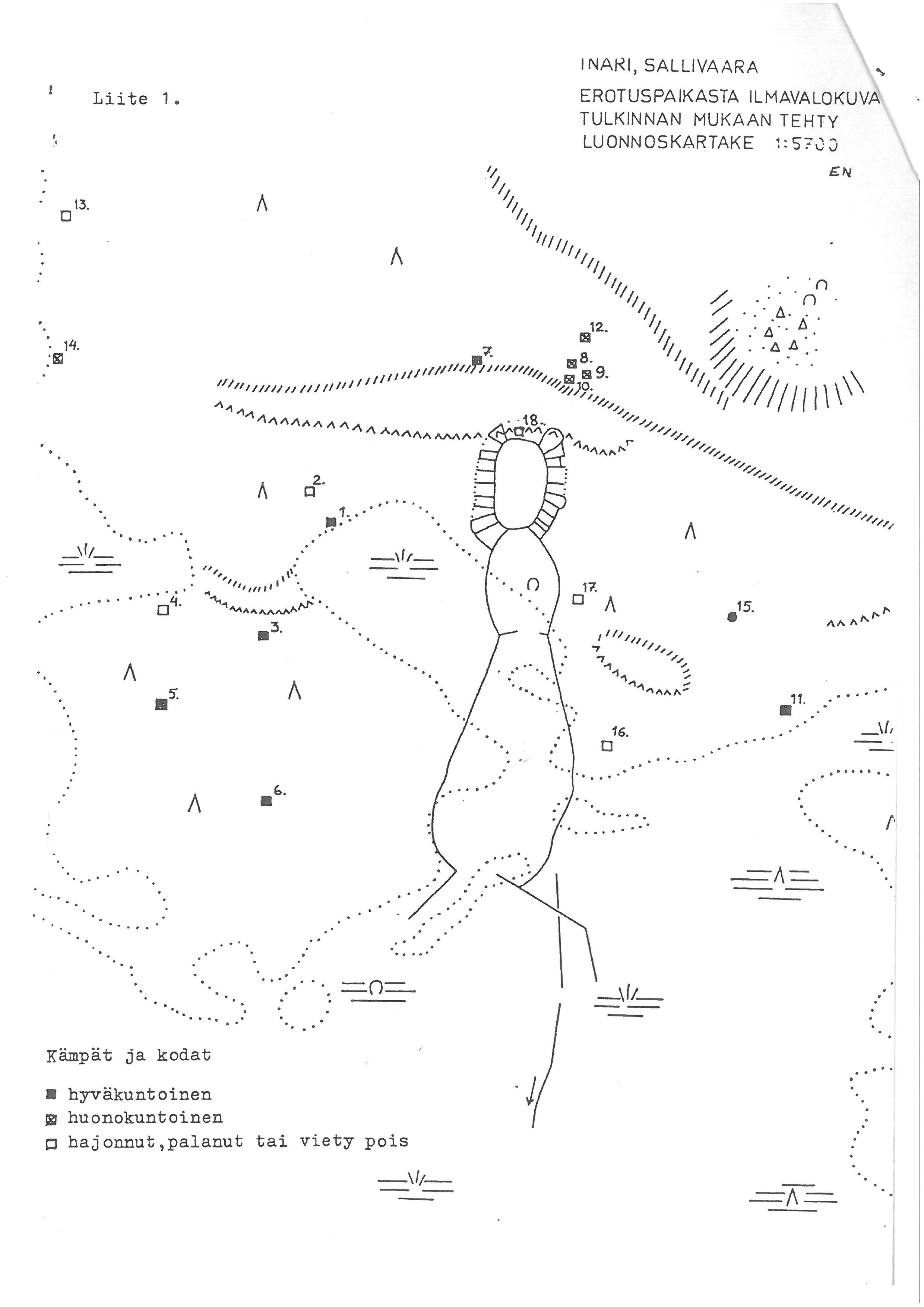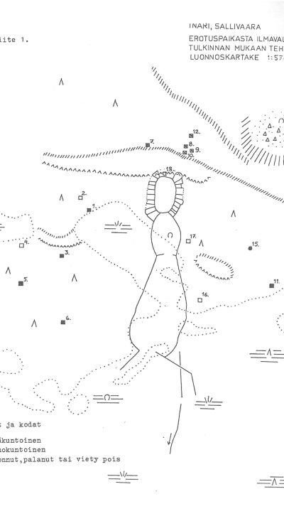 Dokumentointipiirros Sallivaaran tilanteesta 1976. Eero Naskali, Museovirasto.