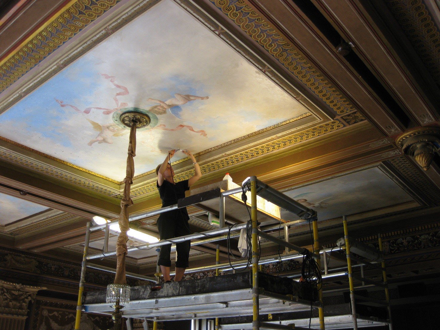 Säätytalon kattomaalauksen värinkiinnitystä. Kuva: Ulla Setälä.