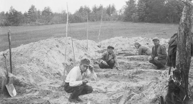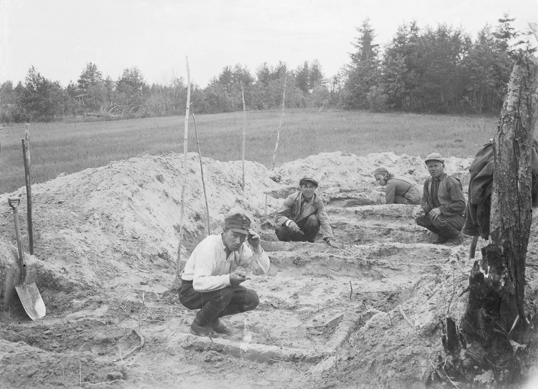 Kaivaukset Vitelen Pirdoilan viikinkiaikaisessa hautakummussa (nro II). Vainajat oli haudattu salvoskehikoiden sisäpuolelle. Etualalta sotamies Erkki Viljamaa, Aleksei Saharov, Heikki Tetsiev ja Annikki Nisula. Kuva: Ella Kivikoski 1943 Museovirasto.