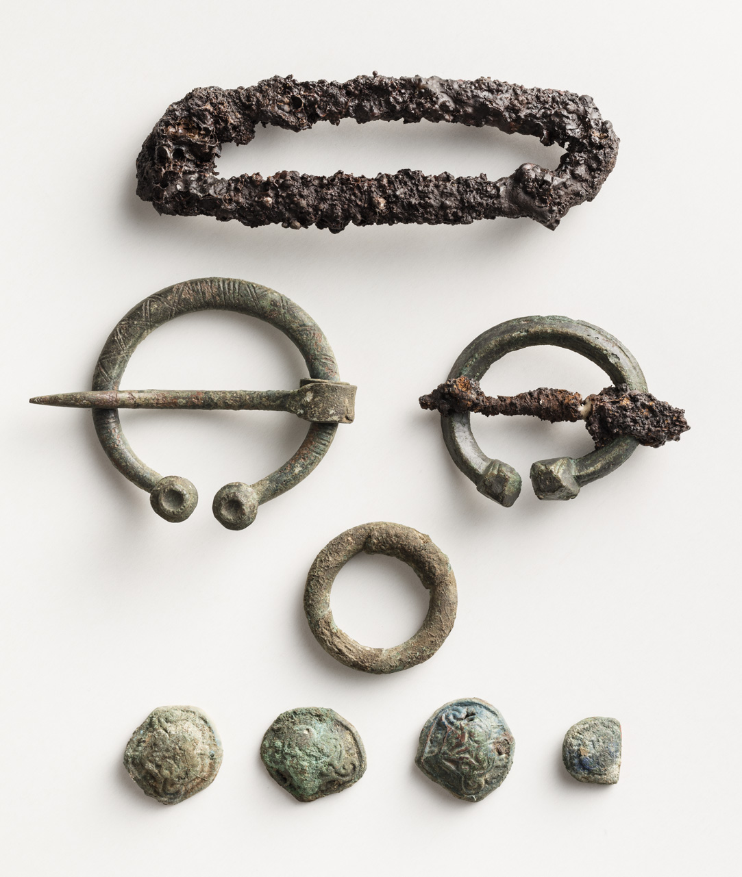 Tulusrauta, kaksi pronssista hevoskenkäsolkea, pronssirengas ja pronssiheloja Vitelen Pirdoilan hautakummun (nro II) haudasta 8. Kuva Museovirasto.