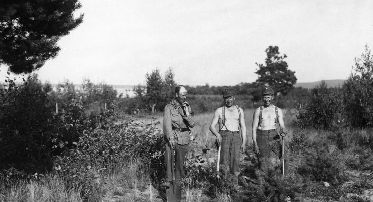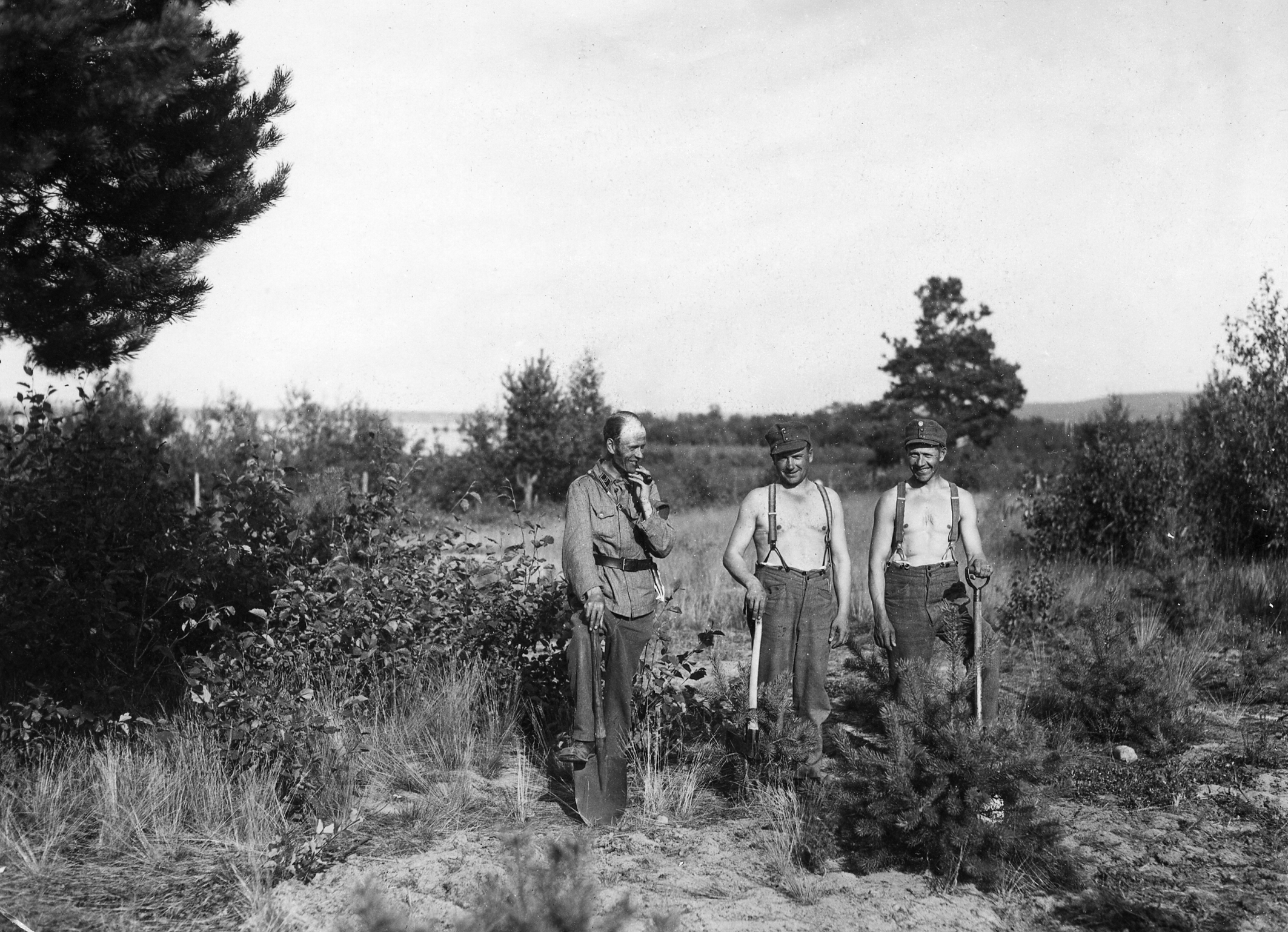 Solomannissa Petroskoin lähellä on ollut paljon asutusta kivi- ja varhaismetallikaudella. Arkeologi Ville Luho sekä kaivauksissa avustaneet sotam. Otto Suihkonen ja alik. Aapeli Liukkonen heinäkuisena poutapäivänä. Kuva A. Äyräpää 1943 Museovirasto.